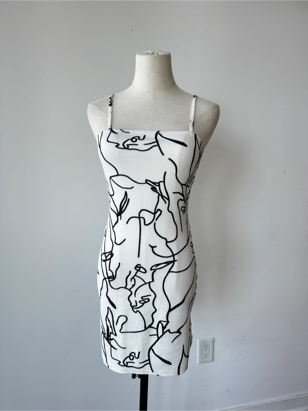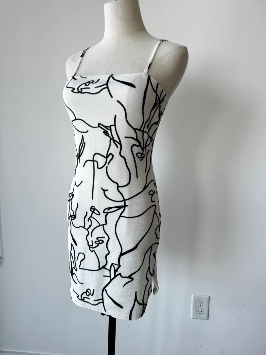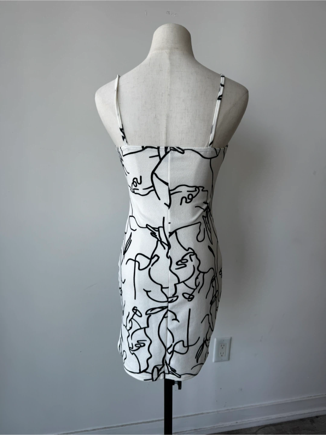 Cute mini dress with a unique black abstract print on a white background Perfect for a night out or a special event!