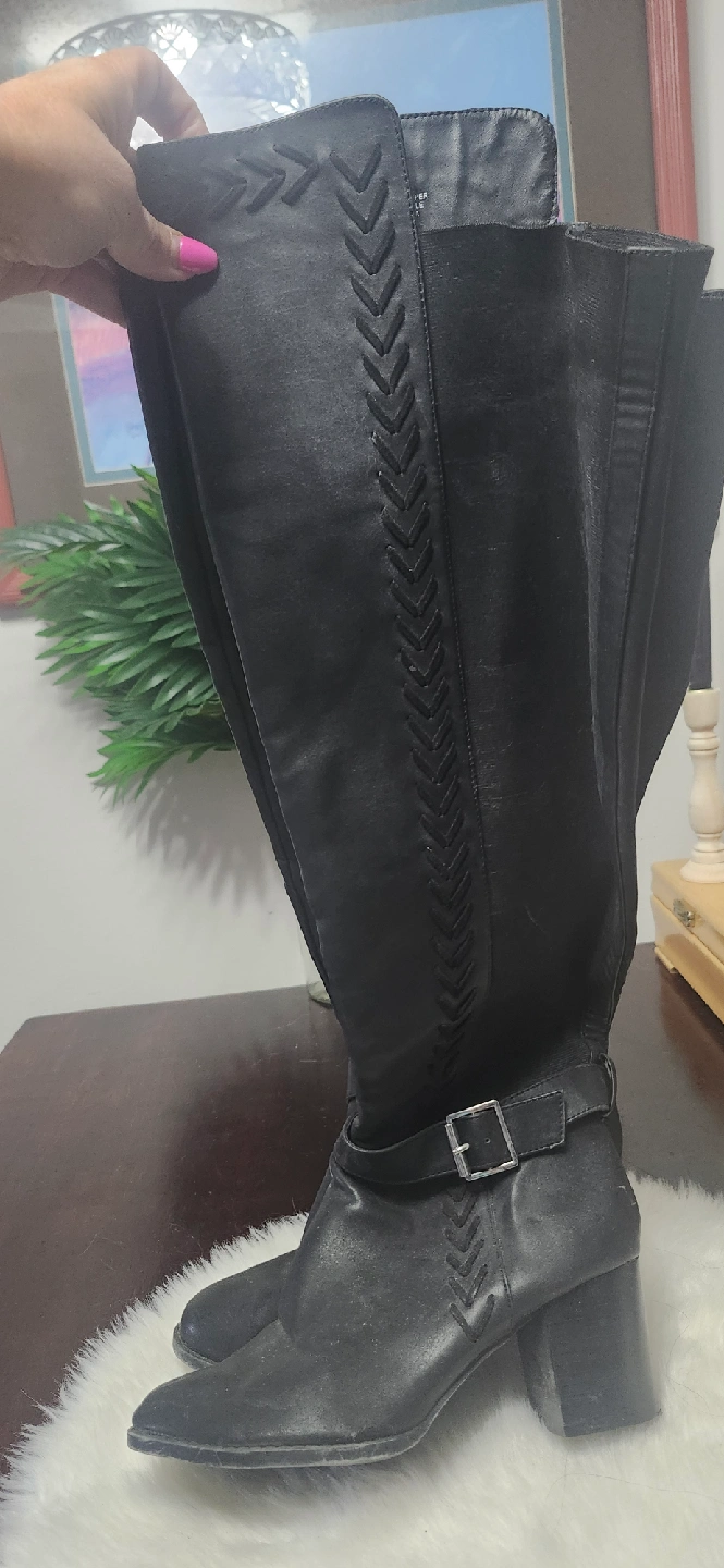 Selling a pair of black over-the-knee boots purchased from Torrid. They're a size 8.5W and made with man-made materials. Perfect for adding a bit of style to your wardrobe!