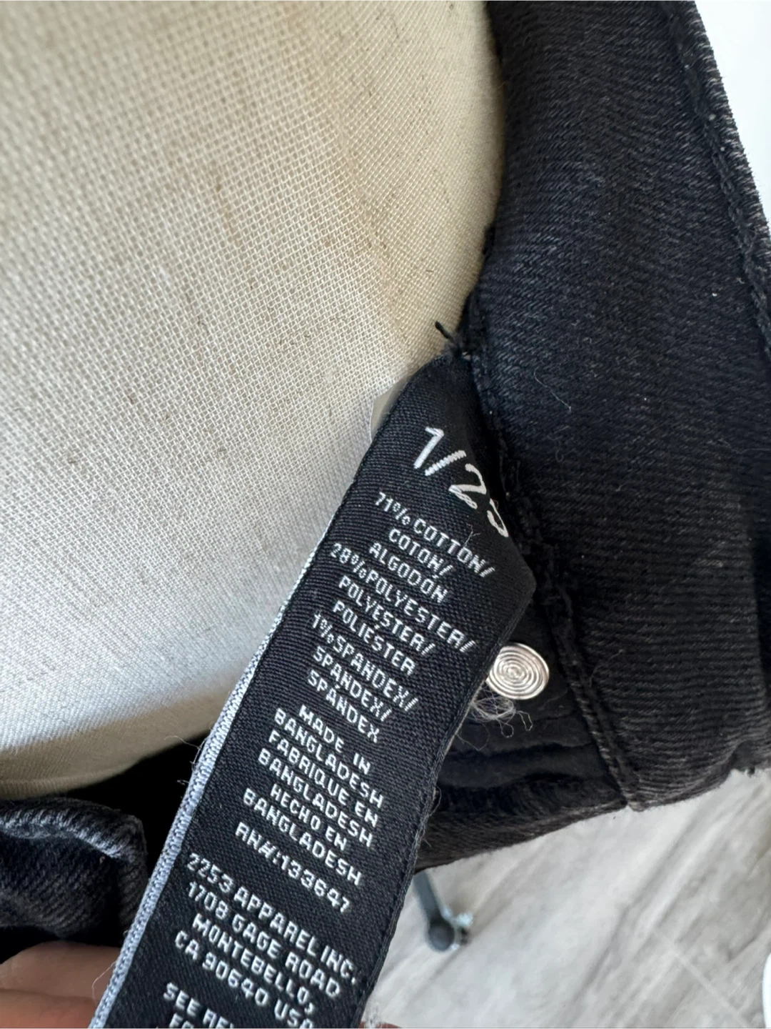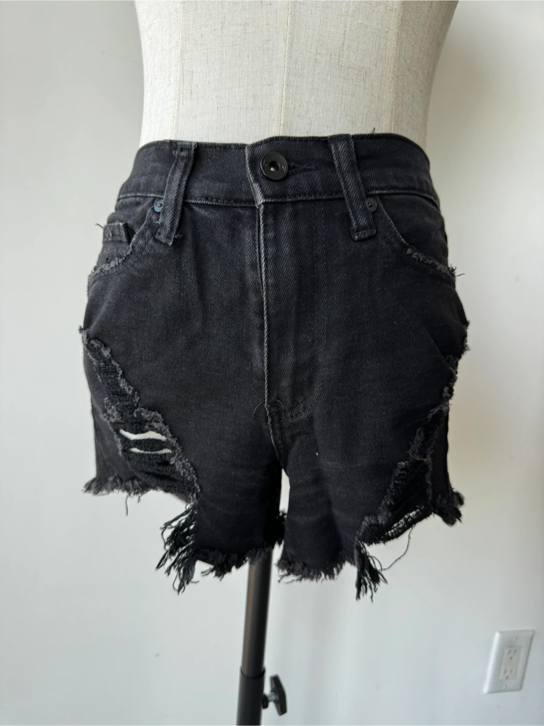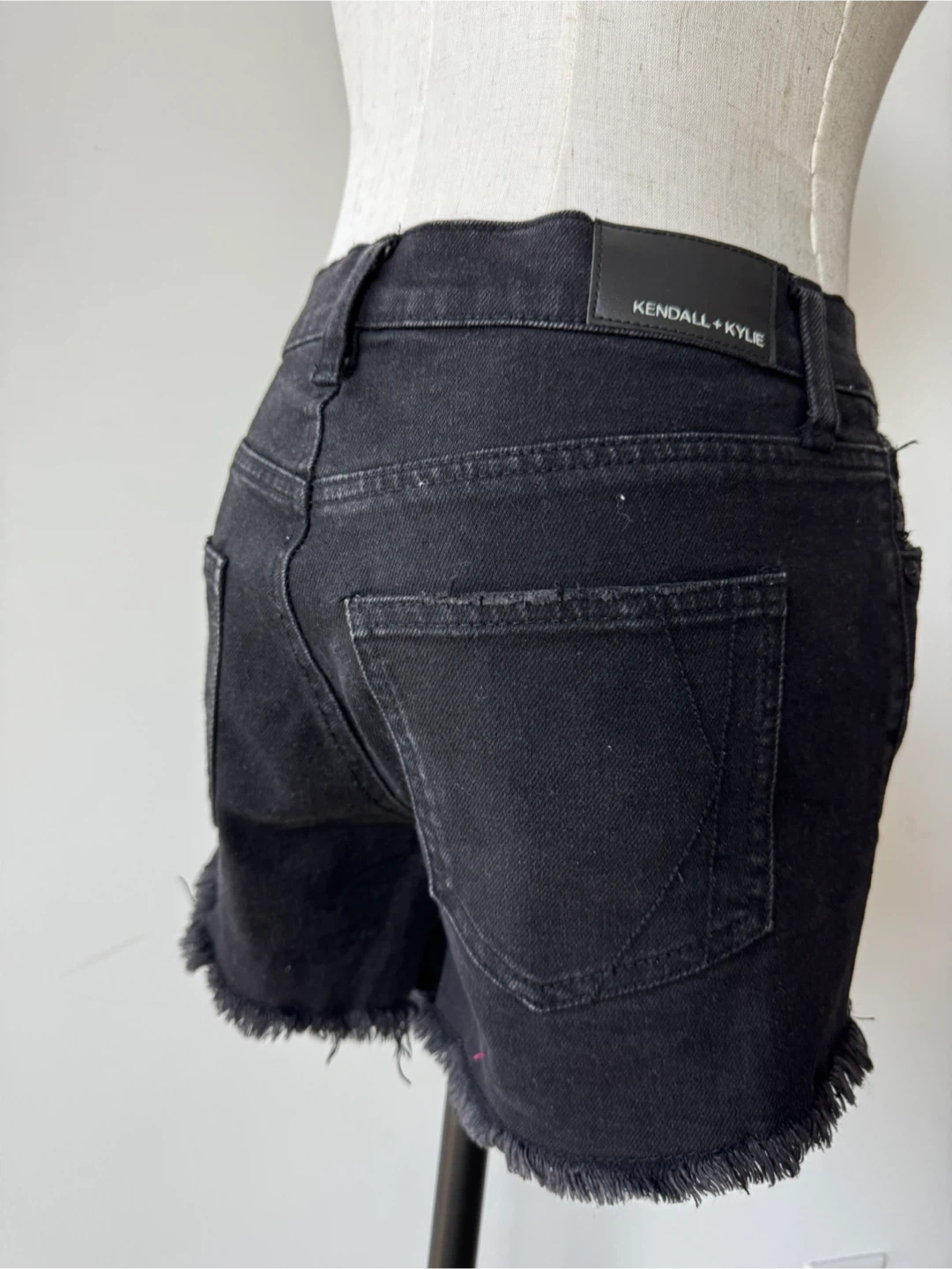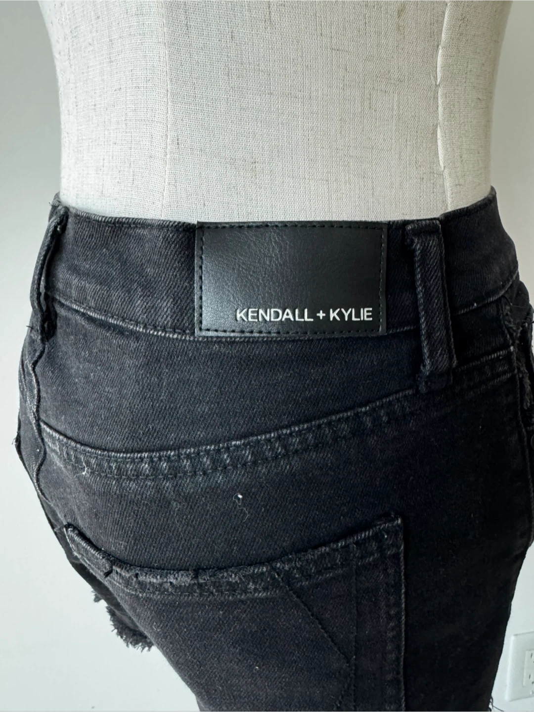 Selling a personally curated outfit Kendall + Kylie black denim shorts and white jersey crop top. The shorts have a cool distressed look with frayed edges. The material is 71% cotton, 28% polyester, and 1% spandex, so they're comfy and have a bit of stretch too