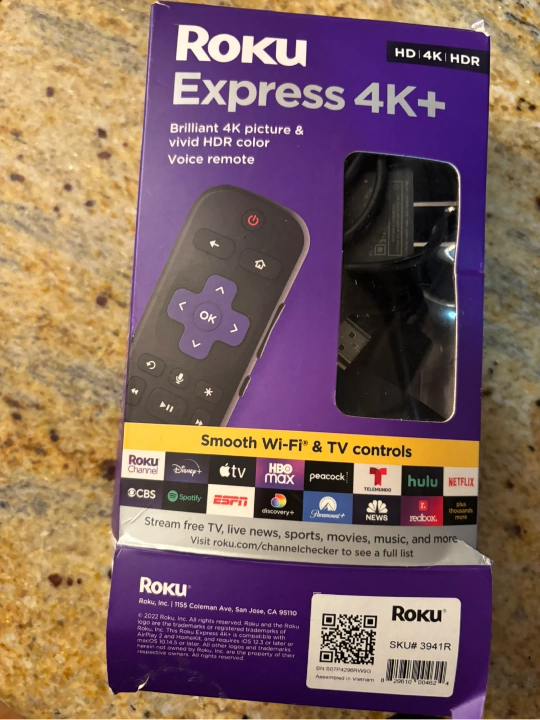 Selling a Roku Express 4K+! It delivers brilliant 4K picture and vivid HDR color. Comes with a voice remote for easy navigation and smooth Wi-Fi & TV controls. Stream free TV, live news, sports, movies, music, and more! The box is included.