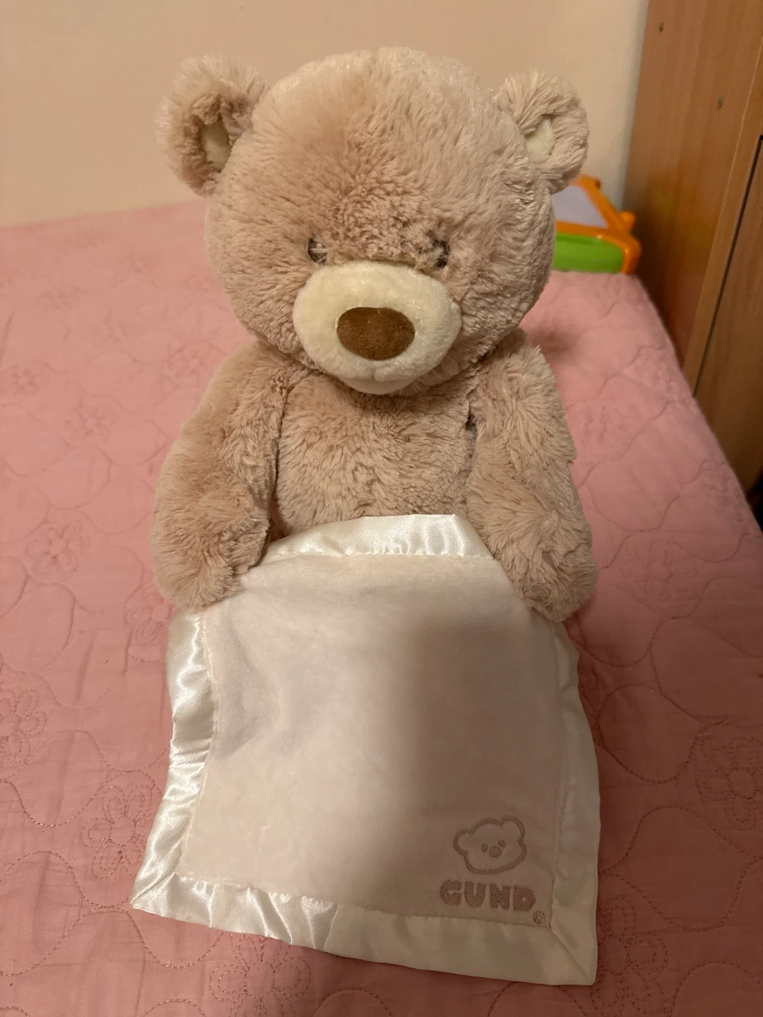 Selling a cute Gund teddy bear holding a soft, white blanket. It's in great condition and ready for a new home!