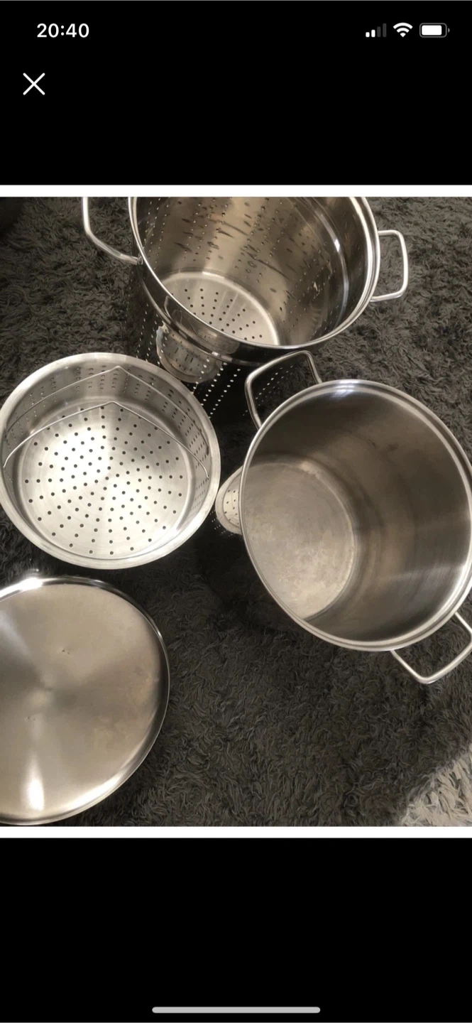 Stainless steel steamer pot set in good condition. Includes a pot, steamer insert, and lid. Perfect for steaming vegetables or seafood!