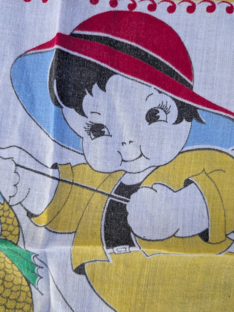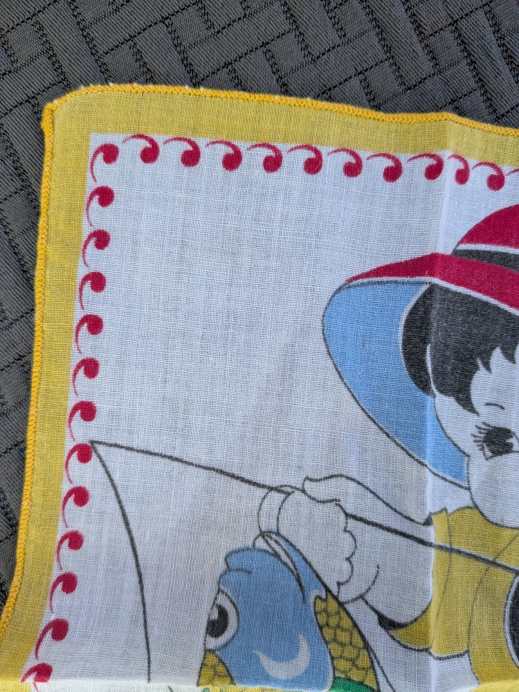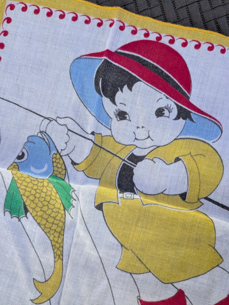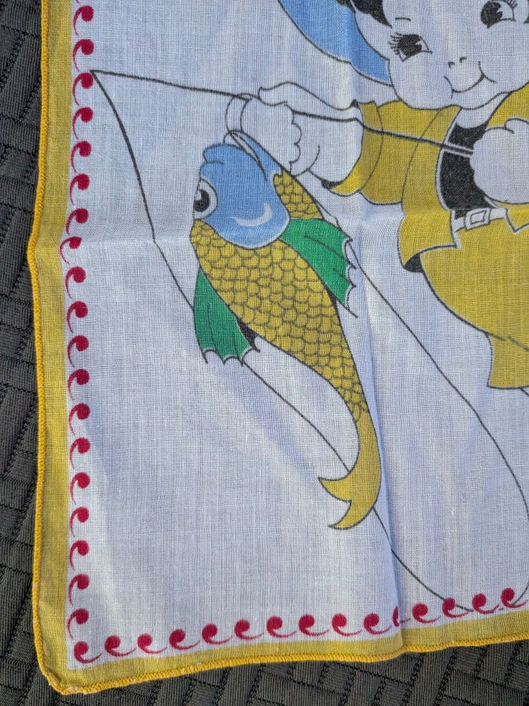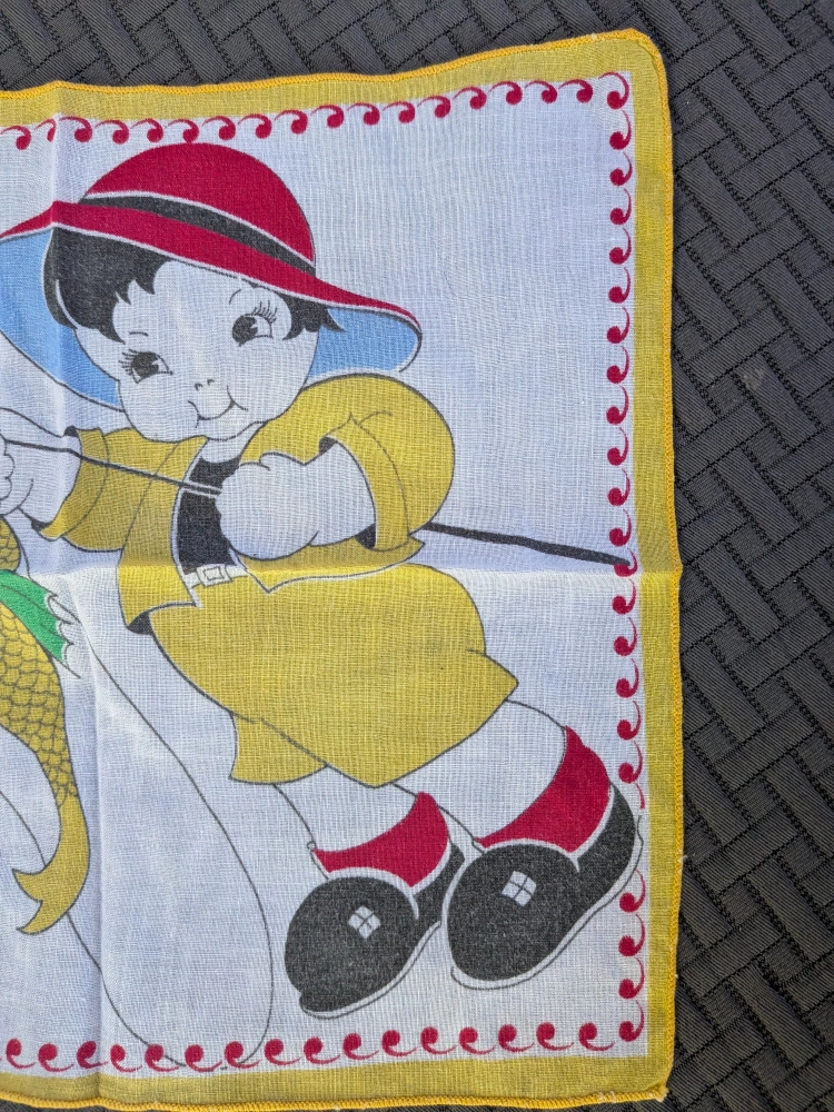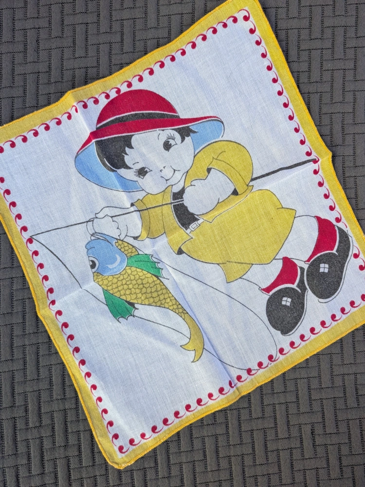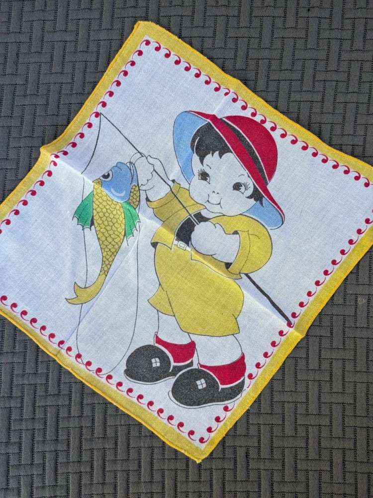 157Here's a charming collectible vintage handkerchief featuring a cute boy fishing! It has a colourful design and a lovely red and yellow border. Perfect for adding a touch of nostalgia to your collection or as a unique decorative piece Delicate cotton fabric Measures about 8.5 x 9 inches Good condition with no tears, no holes, no stains Cash only, no etransfers Location: Etobicoke. Rathburn Rd and Renforth dr. Etobicoke Olympium nearby