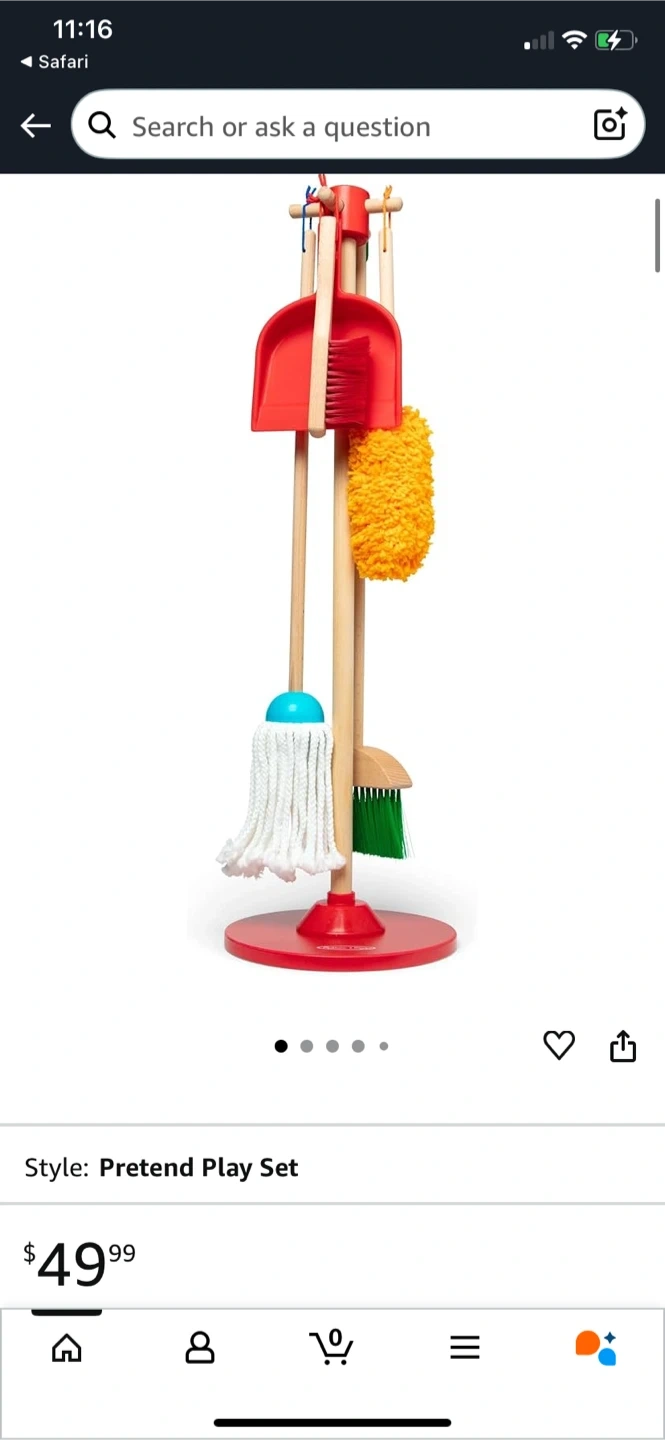 Get your little one started with cleaning early with this Melissa & Doug Pretend Play Cleaning Set! The set includes a mop, broom, duster, dustpan, and stand. Originally bought for $49.99