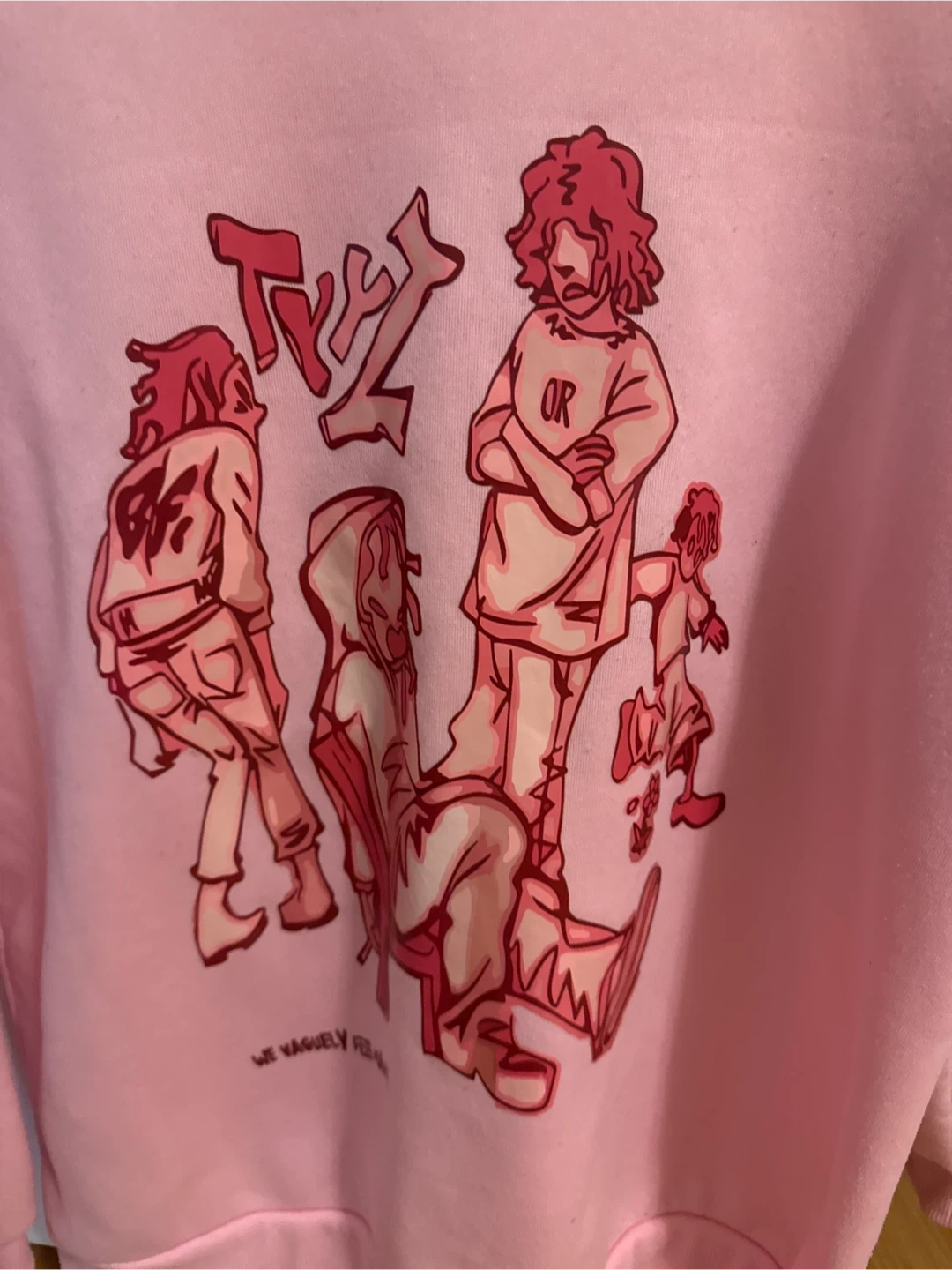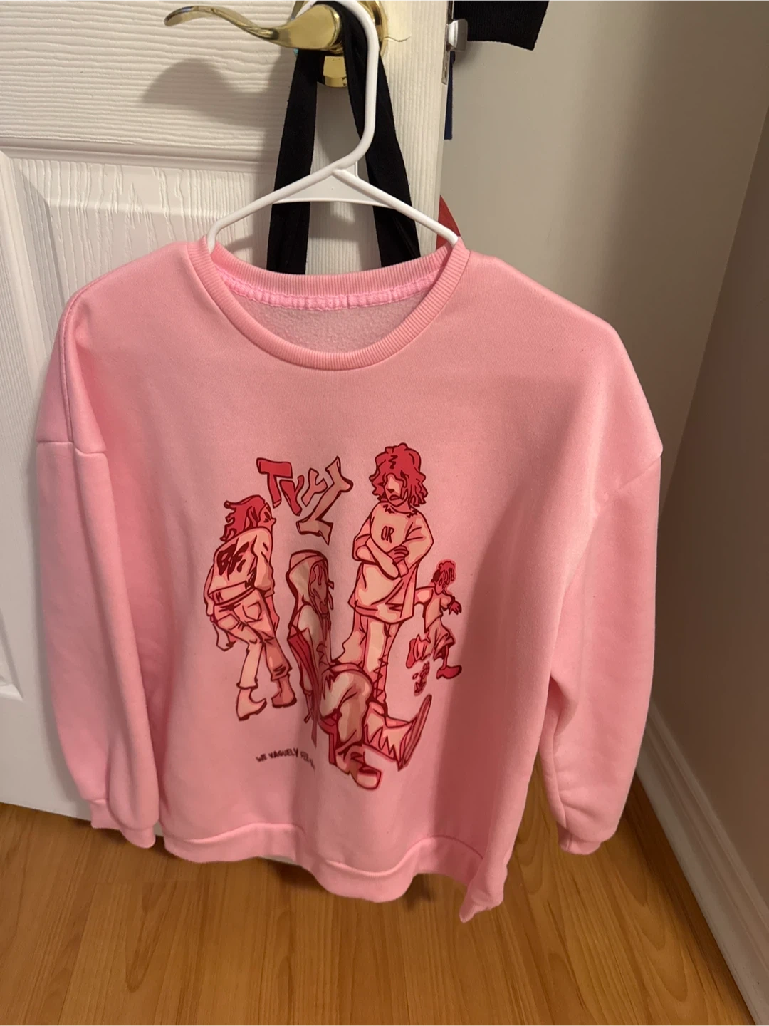 Selling a cute pink crewneck sweatshirt with a unique graphic design! It's in great condition and perfect for adding a pop of colour to your wardrobe