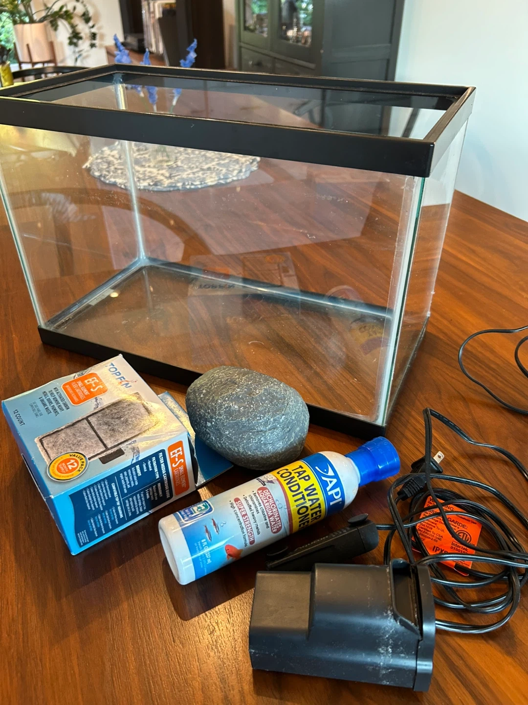 Aquarium with Filter, Decor, and Water Conditioner