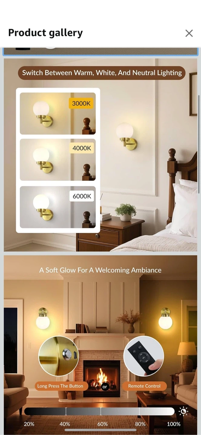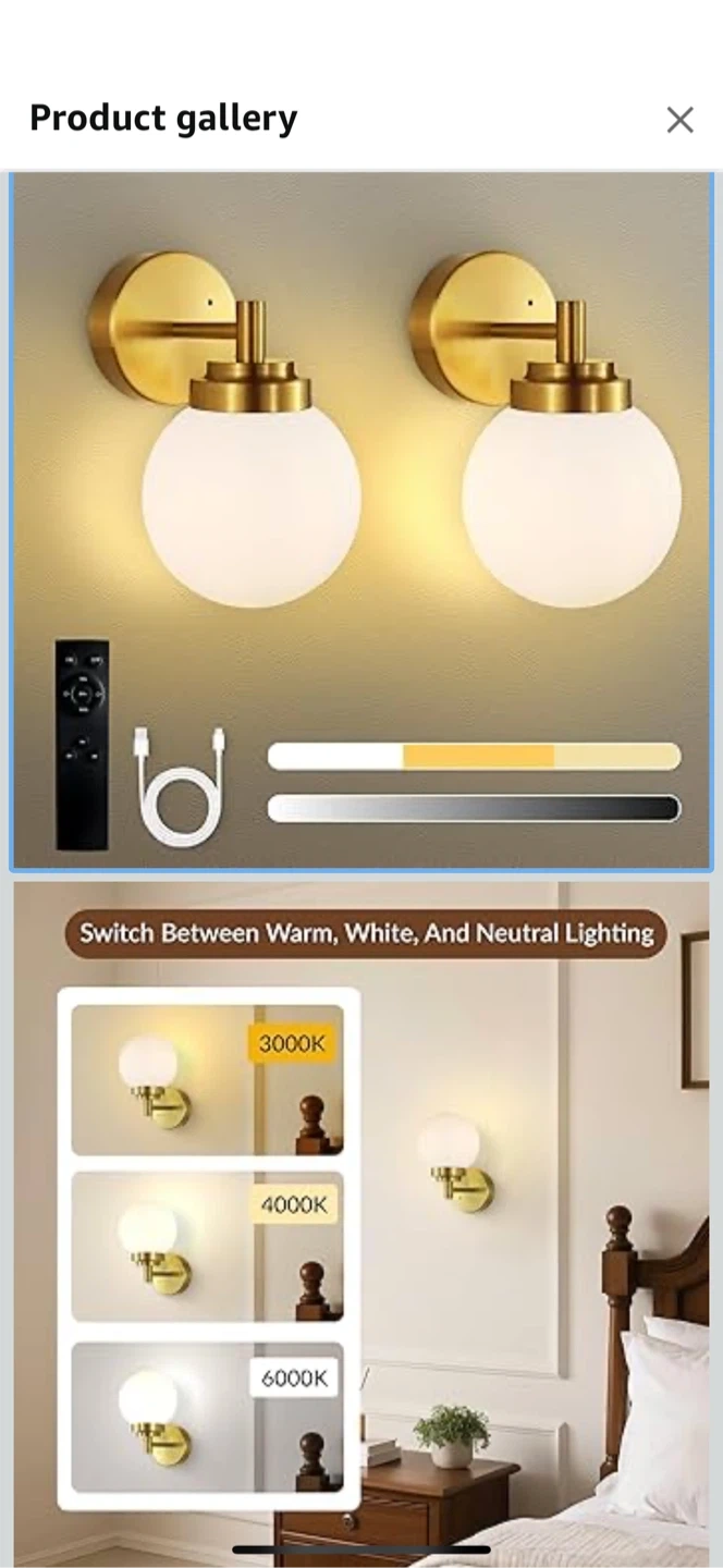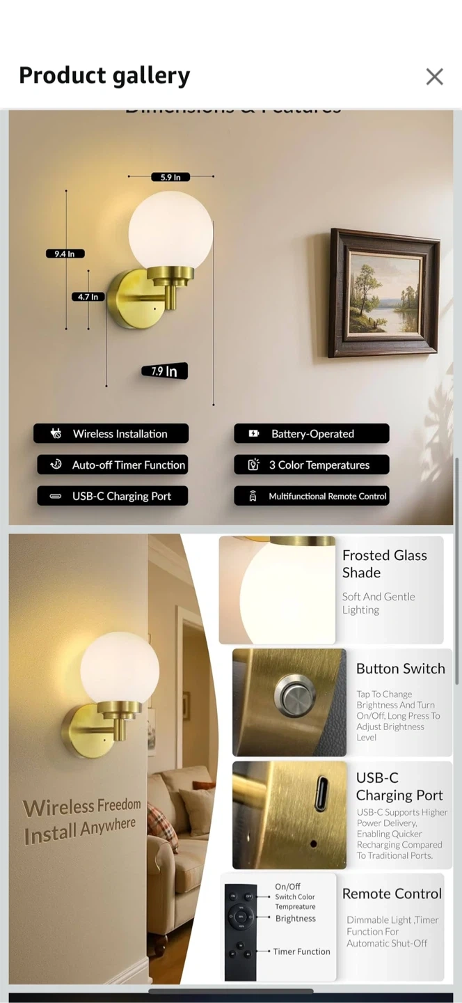 Add a touch of elegance to your space with this set of two gold wall sconces! They feature a frosted glass shade that provides a soft and gentle light. Key features: - Switch between warm, white, and neutral lighting (3000K, 4000K, 6000K) - Wireless installation for easy setup - Battery-operated for convenience - Auto-off timer function - USB-C charging port - Multifunctional remote control for dimming and timer functions Dimensions: - 7.4 inches tall - 4.7 inches wide - 5.9 inches in diameter (glass shade) - 7.9 inches deep