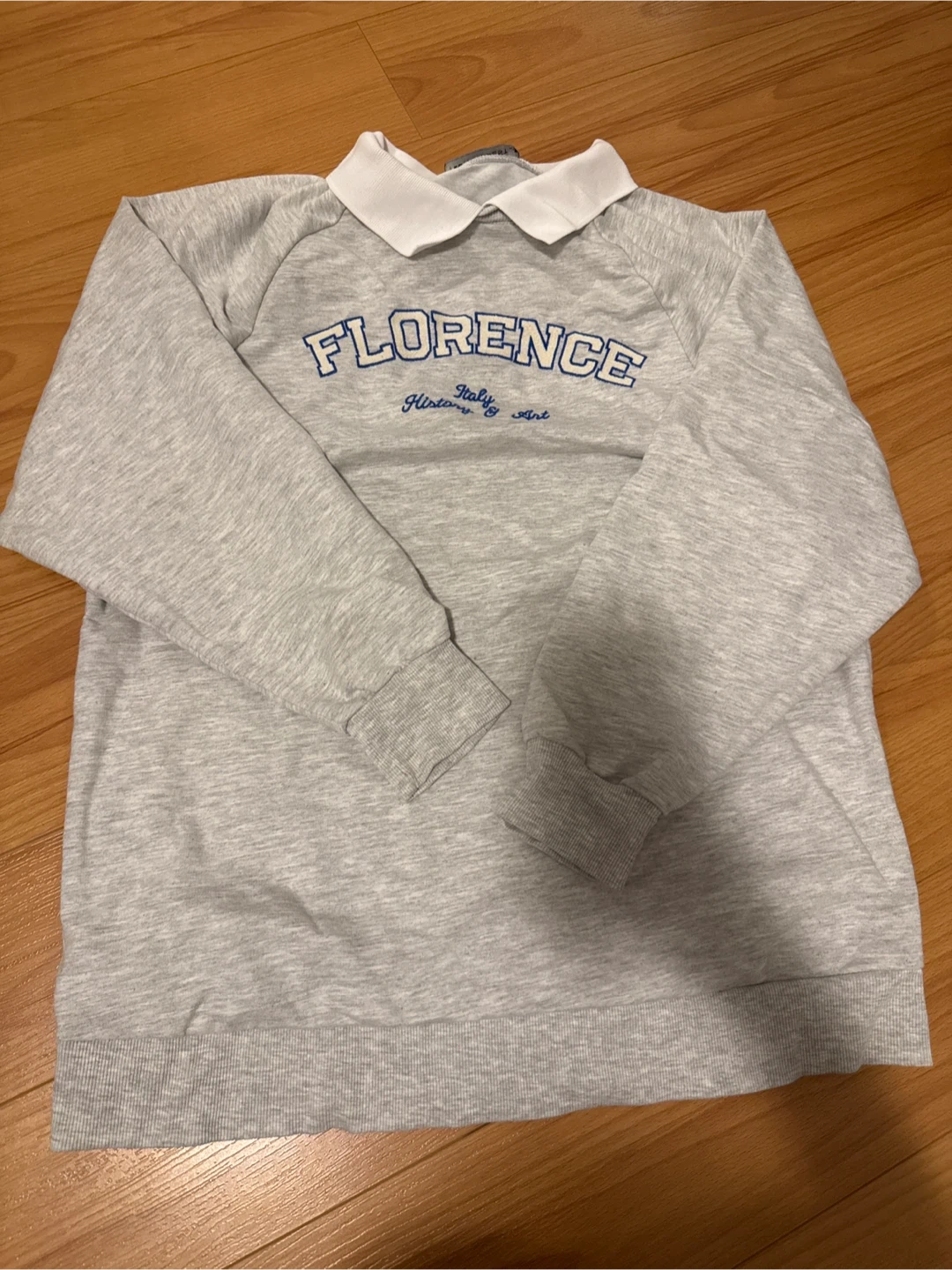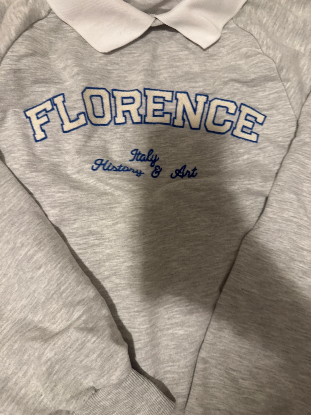 Cozy grey sweatshirt featuring 'Florence Italy History & Art' in blue lettering! It has a white collar and is perfect for a casual, comfy look