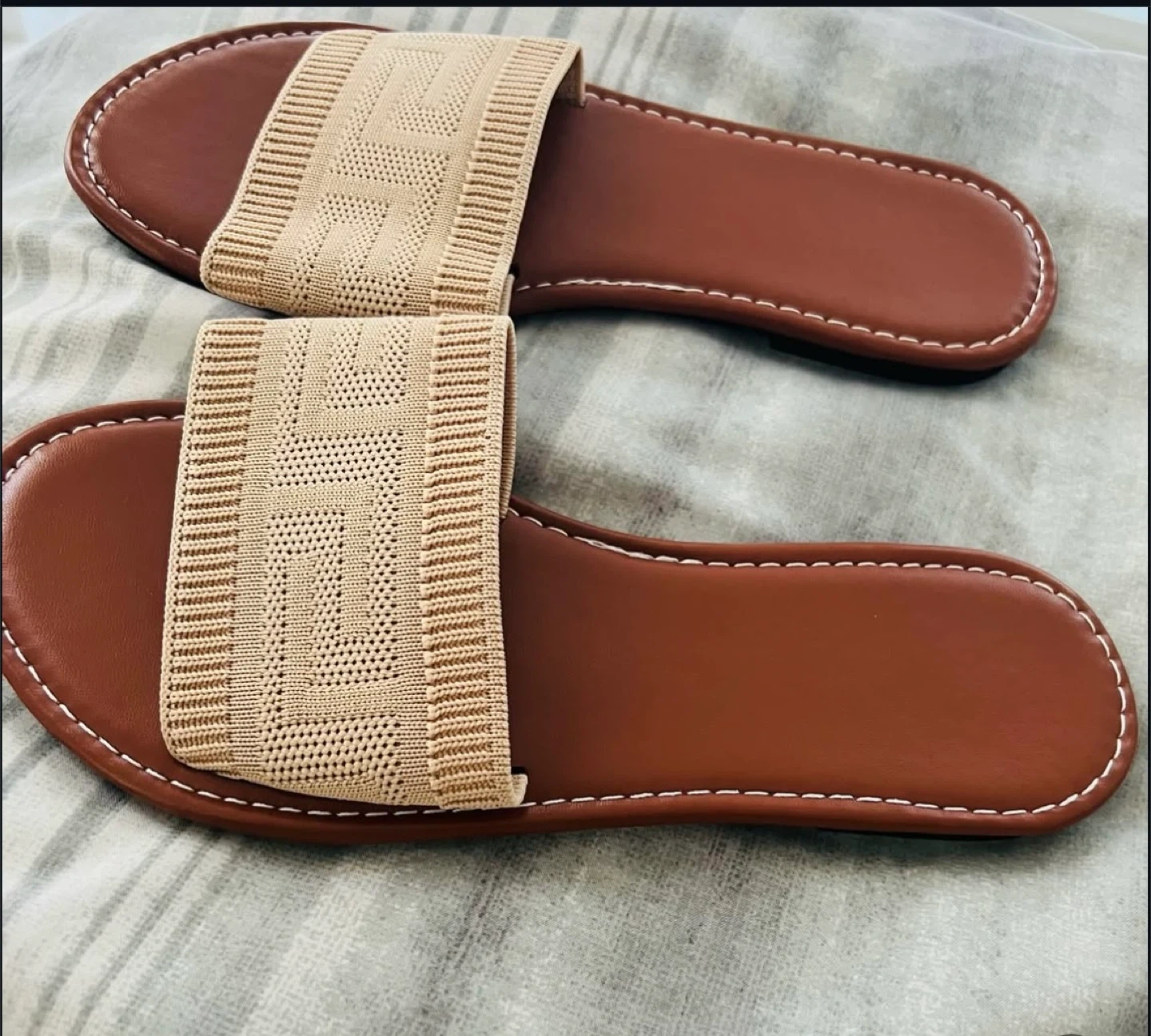 87Selling a pair of comfy slide sandals! They feature a stylish beige patterned strap and a brown sole. Perfect for slipping on for a casual day out
