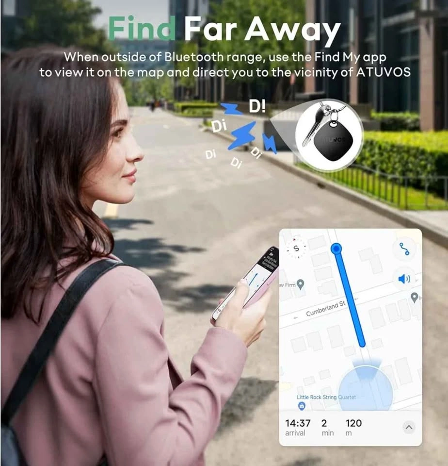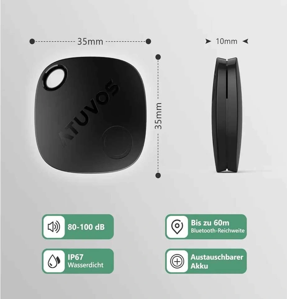 198New in box. 2 pcs inside. Amazon price is $30 plus tax. Works with Apple "Find My" app to help find your stuff by ringing your ATUVOS tracker through the built-in speaker (loud ringing, 80-100 decibels), or just ask Siri for help. (Note: This product only supports iOS devices, not Android devices. No UWB function) ATUVOS smart tracker finds items further away with hundreds of millions of Apple devices in the Apple "Find My" network. (No monthly or annual fees). The Bluetooth range of the ATUVOS bluetooth tracker can reach up to 200 feet without any obstacles. When the tracking distance is beyond the Bluetooth range, you can use the "Find My" app to locate your ATUVOS smart tracker on a map and even turn on navigation to guide you to its vicinity. For privacy reasons, the "Find My" app network is encrypted and anonymous, and location data and history are not stored on the ATUVOS tracker. Avoid losing your belongings in the first place with instant left-behind alerts via the Apple "Find My" app. If the ATUVOS locator is lost, turn on Lost Mode in Apple "Find My" and you will be automatically notified when it is detected by the Apple "Find My" network. The ATUVOS item finder is both water-resistant (with an IP67 rating) and durable. It is powered by a CR2032 coin cell battery with a life of over 1 year. When the battery is low, the ATUVOS Finder will notify you to replace it.