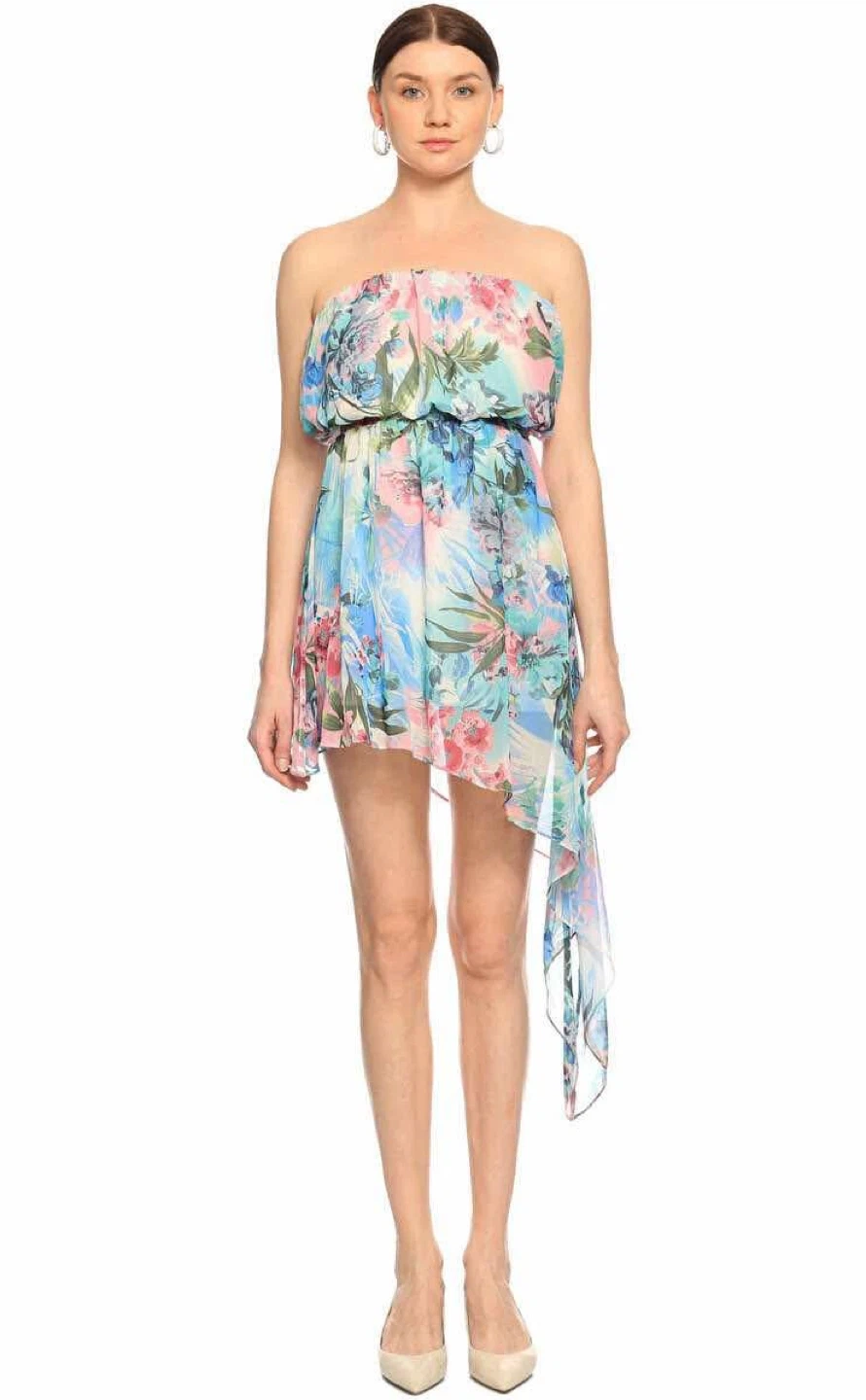 This is a lovely strapless summer dress with an asymmetrical hemline. It features a floral pattern with shades of blue and pink. Perfect for a summer day or special occasion!