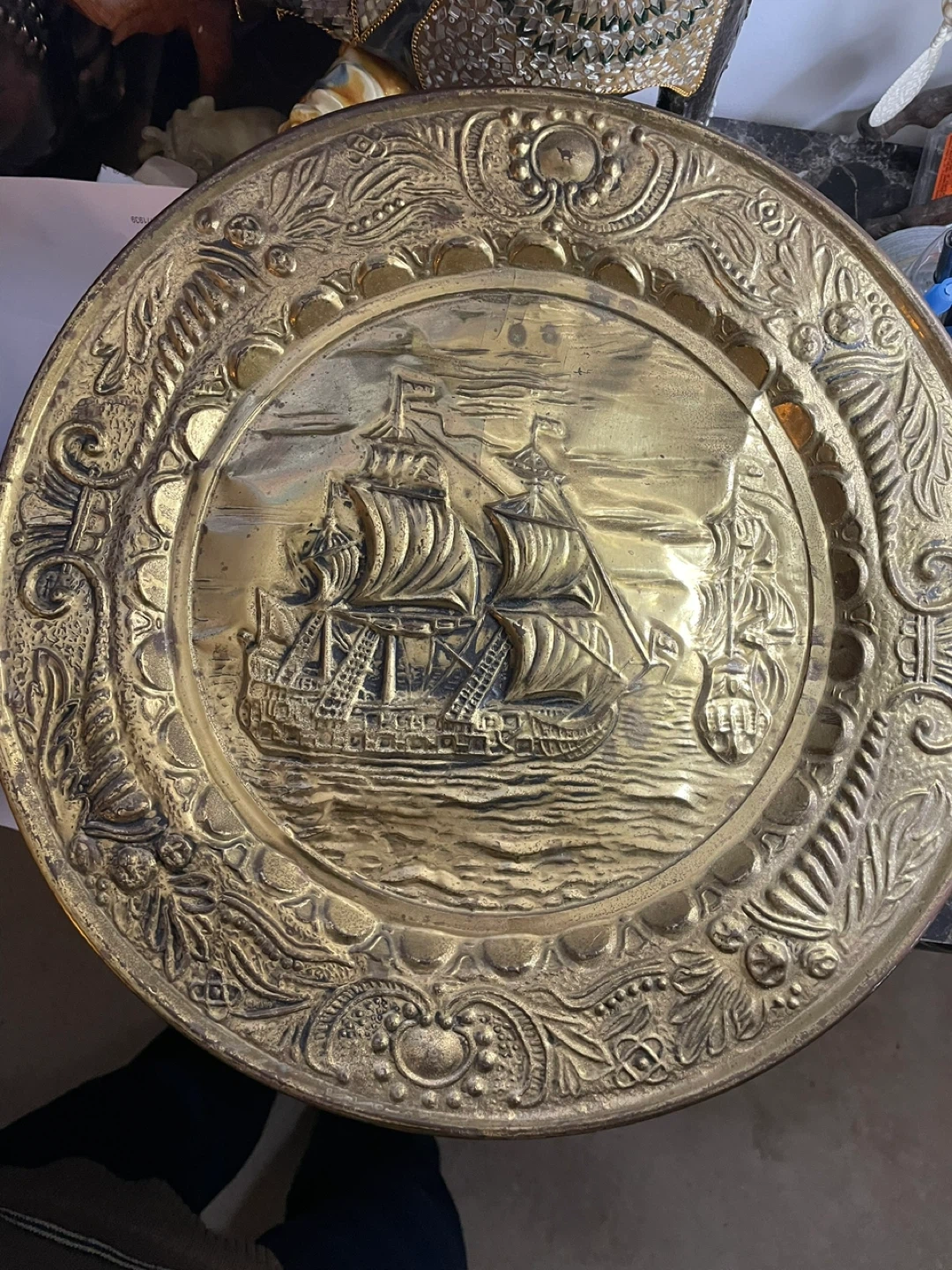 Selling a vintage brass decorative plate featuring a detailed ship design. It has intricate patterns around the edges and a central image of sailing ships on the water. A unique piece for collectors or anyone looking to add a touch of vintage charm to their home decor