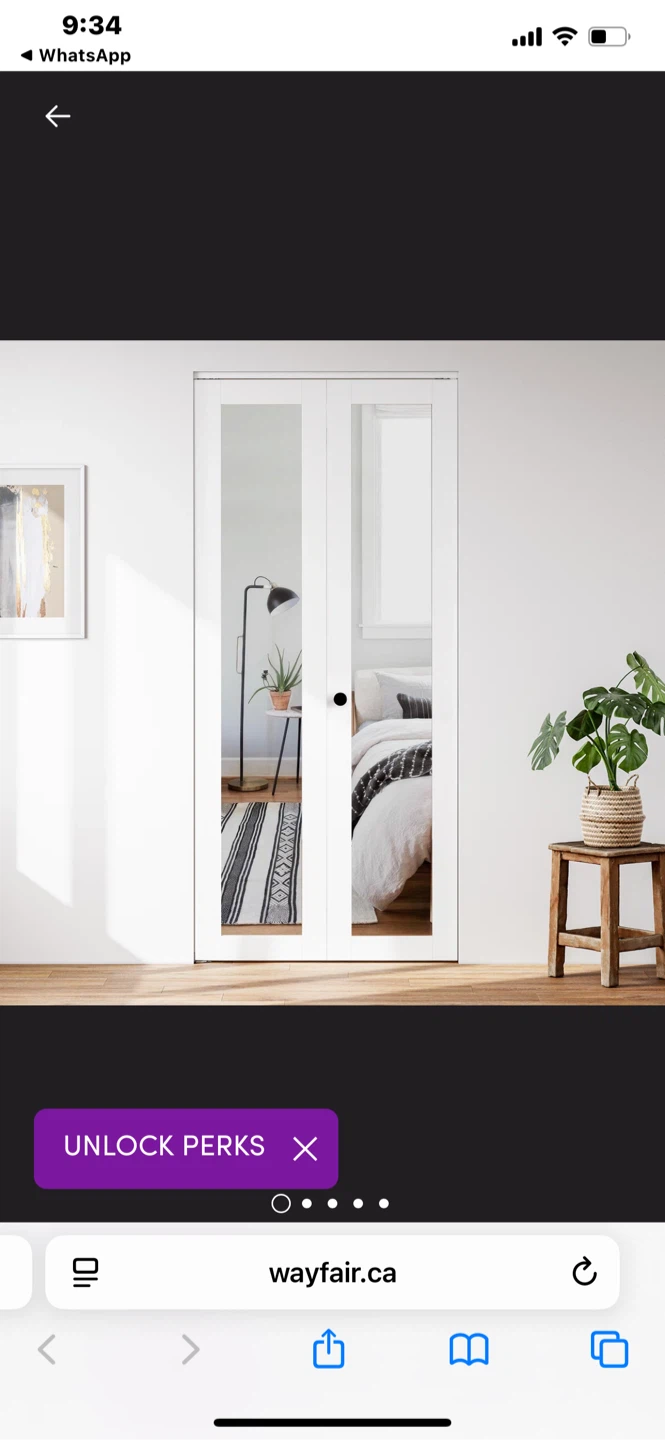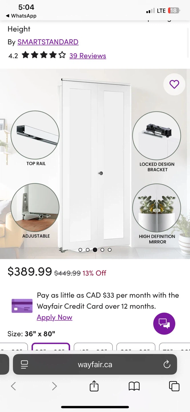 Selling a SMARTSTANDARD bi-fold door with a mirror. It's 36" x 80". Originally bought for $389.99. It has a top rail, adjustable features, a locked design bracket, and a high-definition mirror. Great for adding a sleek look to any room!