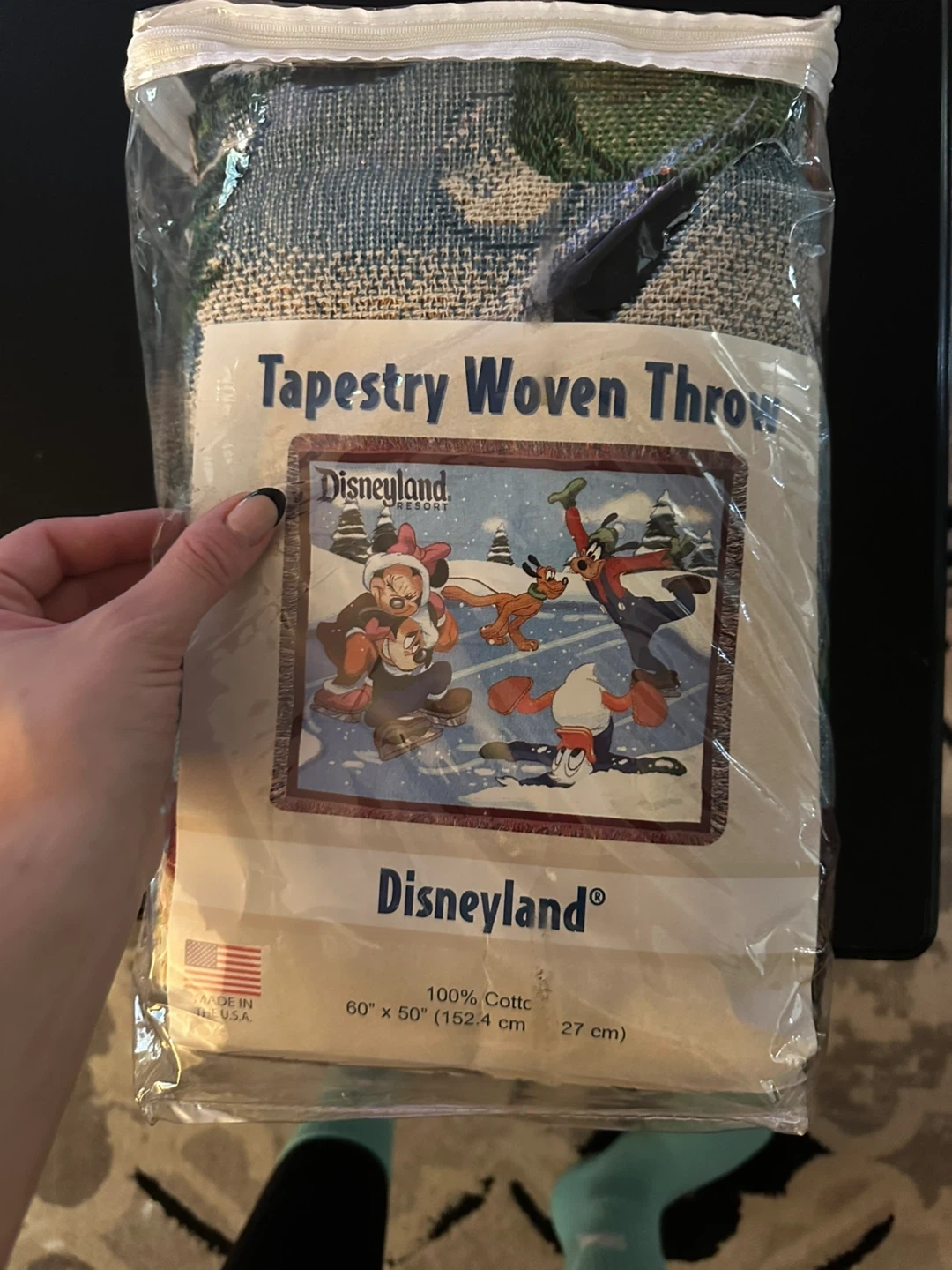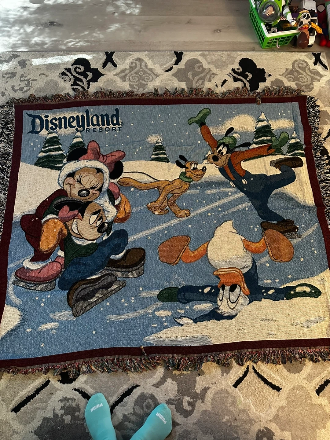 I'm selling a Disneyland Resort tapestry woven throw blanket! It's made of 100% cotton and measures 60" x 50" (152.4 cm x 27 cm). It features Mickey Mouse, Minnie Mouse, Pluto, Goofy, and Donald Duck ice skating in a winter scene