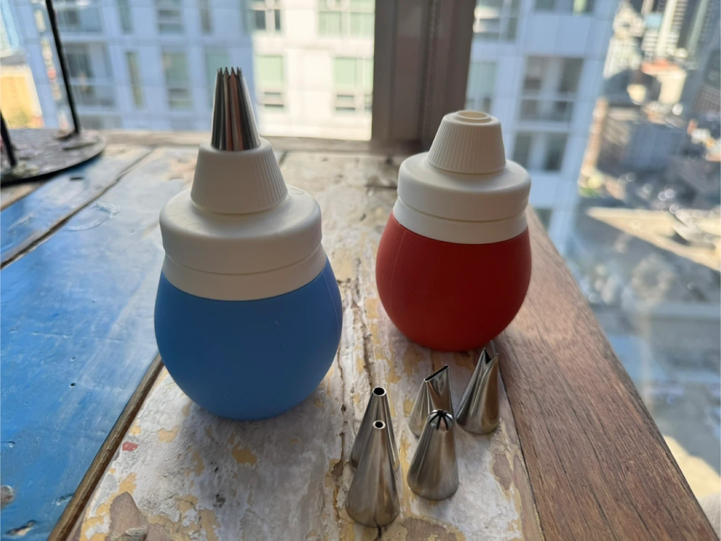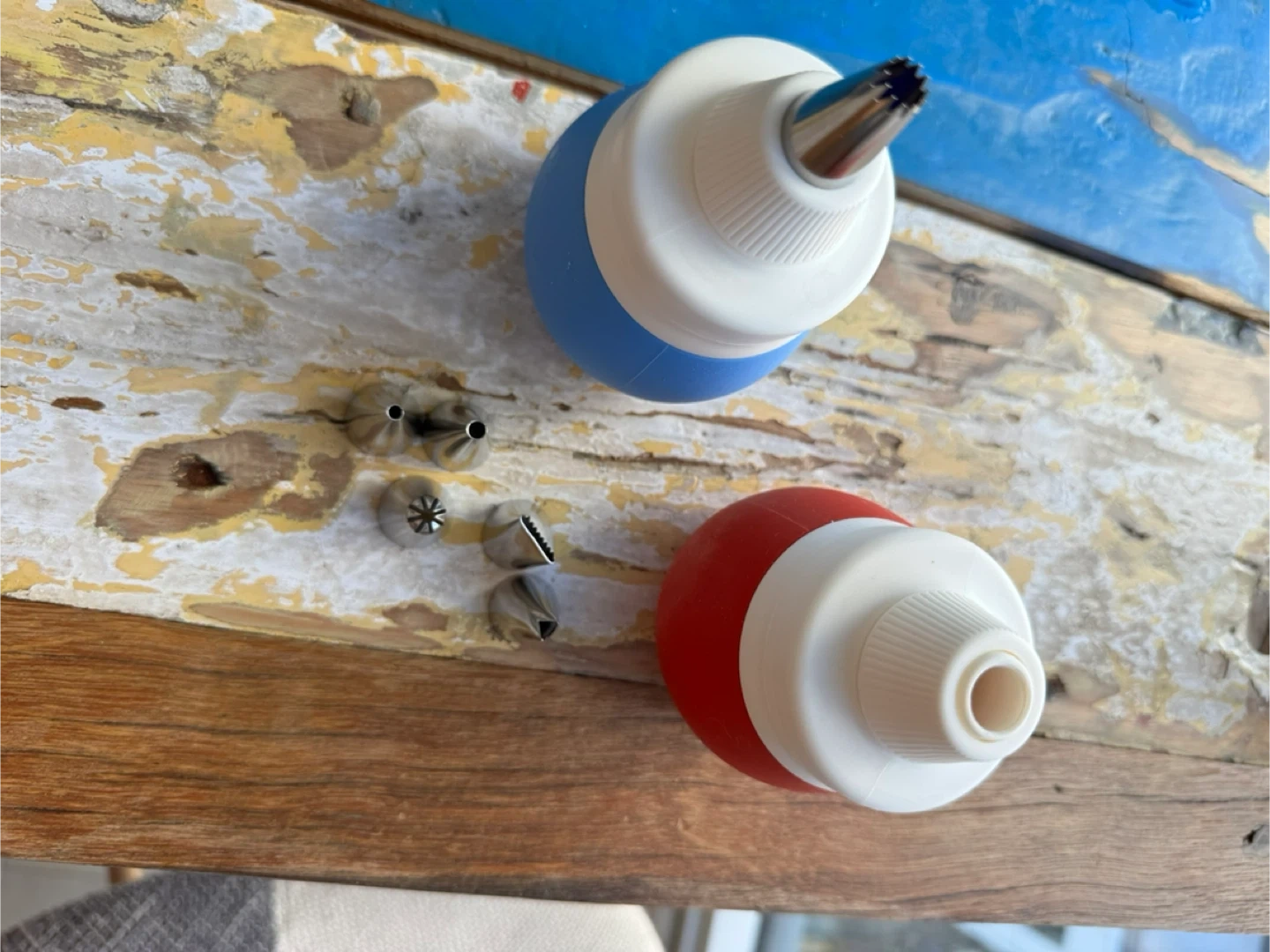 I'm selling a cake decorating set that includes an icing syringe and various tips! The set comes with two syringes, one in blue and one in red, along with several decorating tips. Perfect for all your baking needs