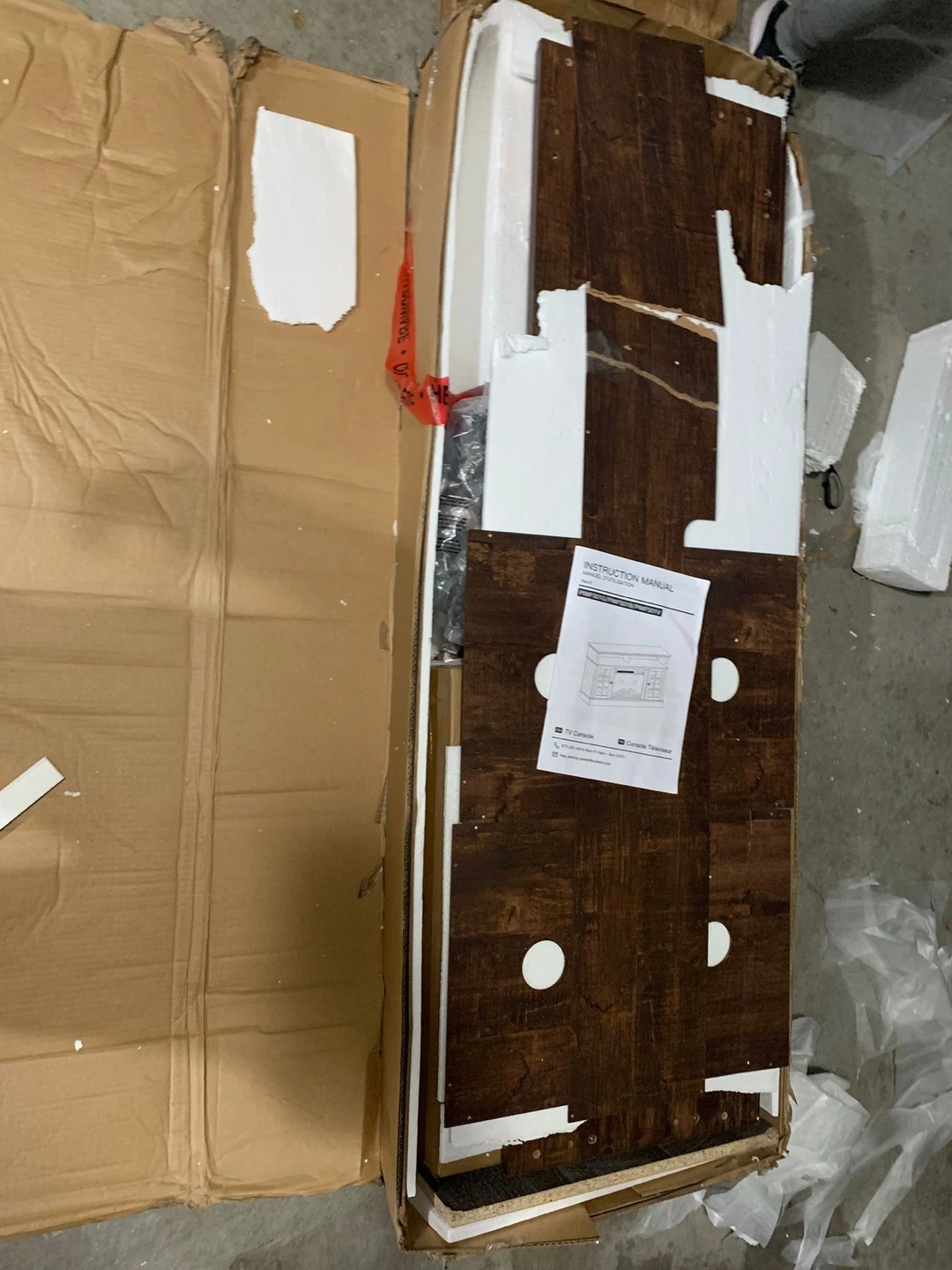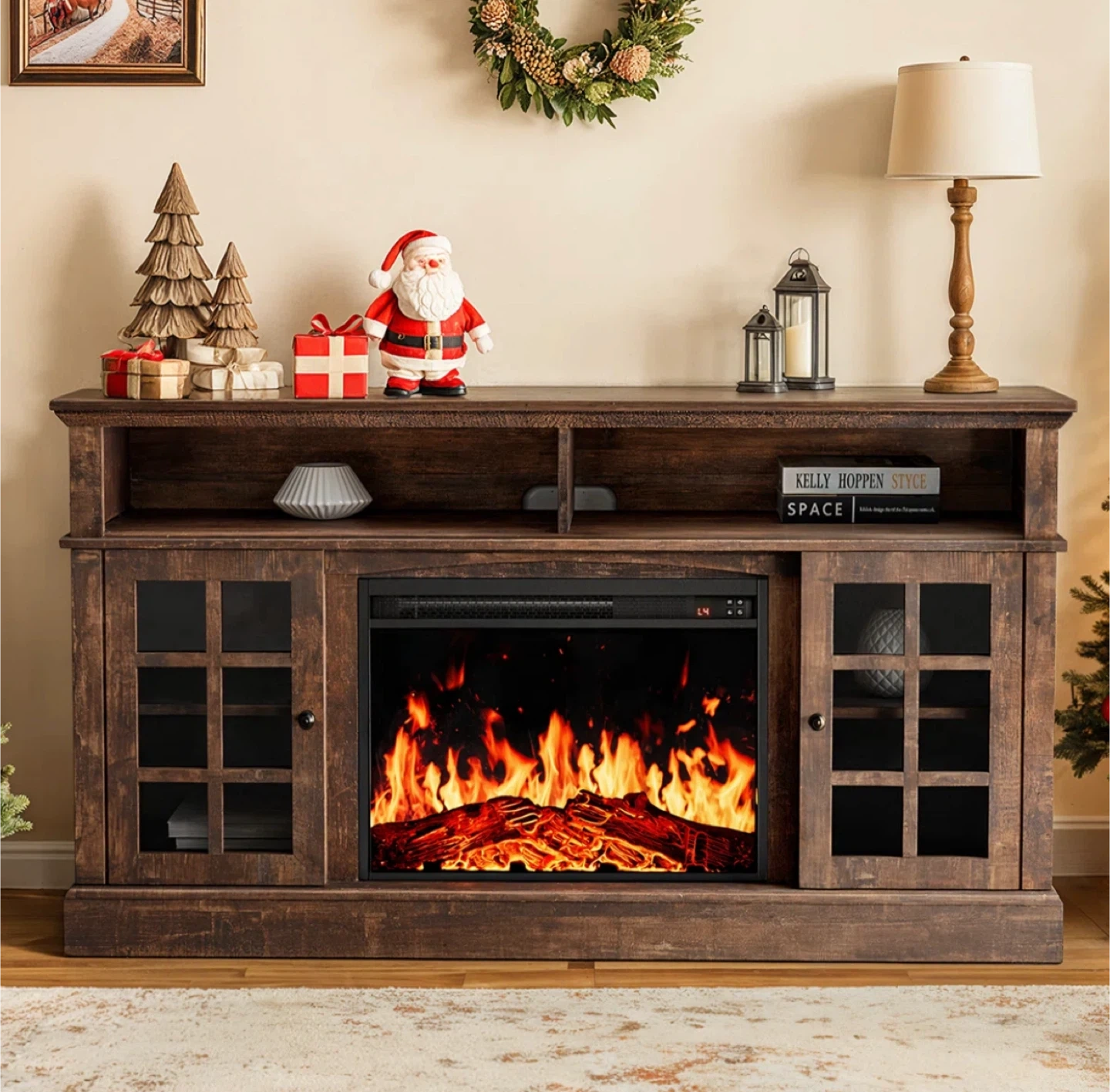 This is a dark brown fireplace TV stand that can hold up to a 65" TV. It has glass doors on either side of the fireplace. The dimensions are: