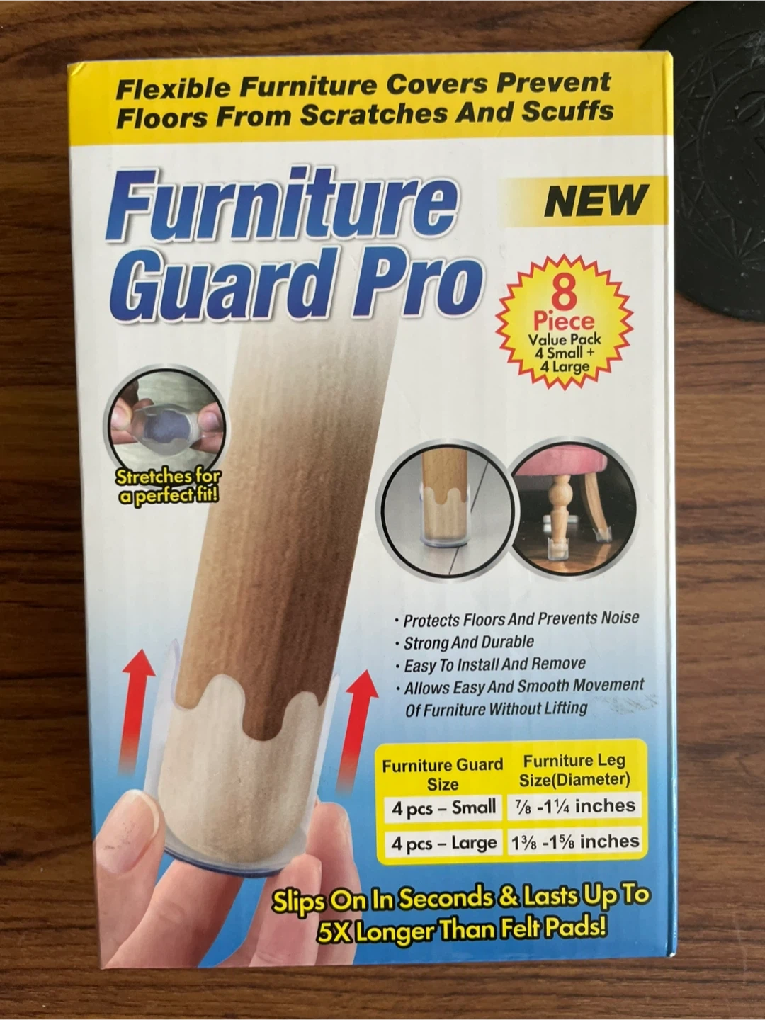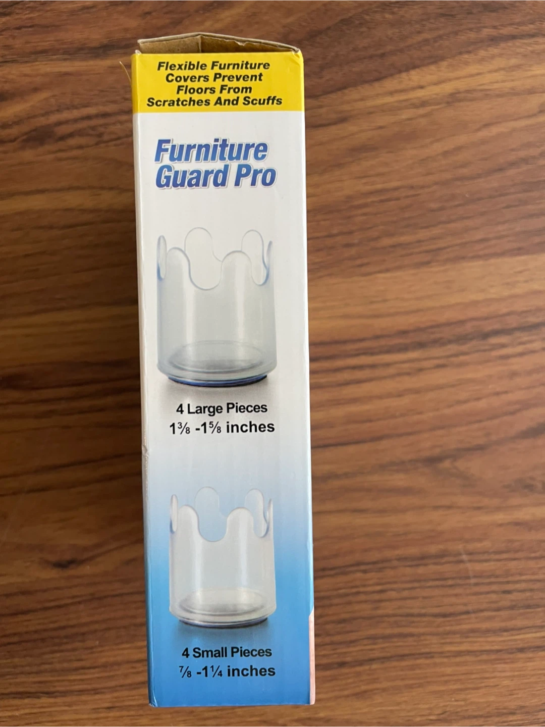 Keep your floors protected with this Furniture Guard Pro set! It includes 8 pieces: 4 small (fitting furniture legs of 7/8 - 1 1/4 inches) and 4 large (fitting furniture legs of 1 3/8 - 1 5/8 inches). These flexible furniture covers prevent scratches and scuffs, while also reducing noise. They're easy to install and remove, allowing for easy and smooth movement of furniture without lifting. They slip on in seconds and last up to 5x longer than felt pads!