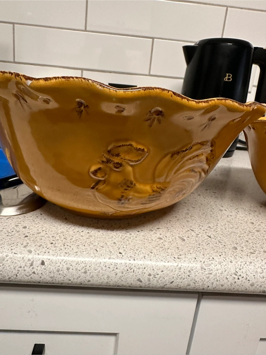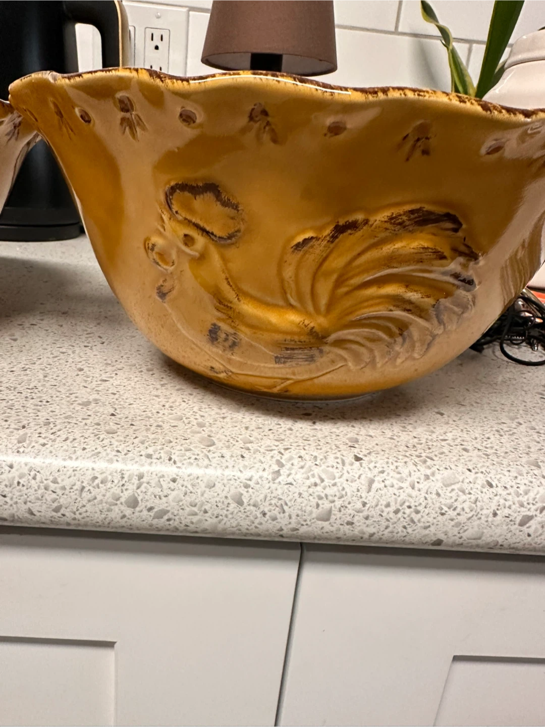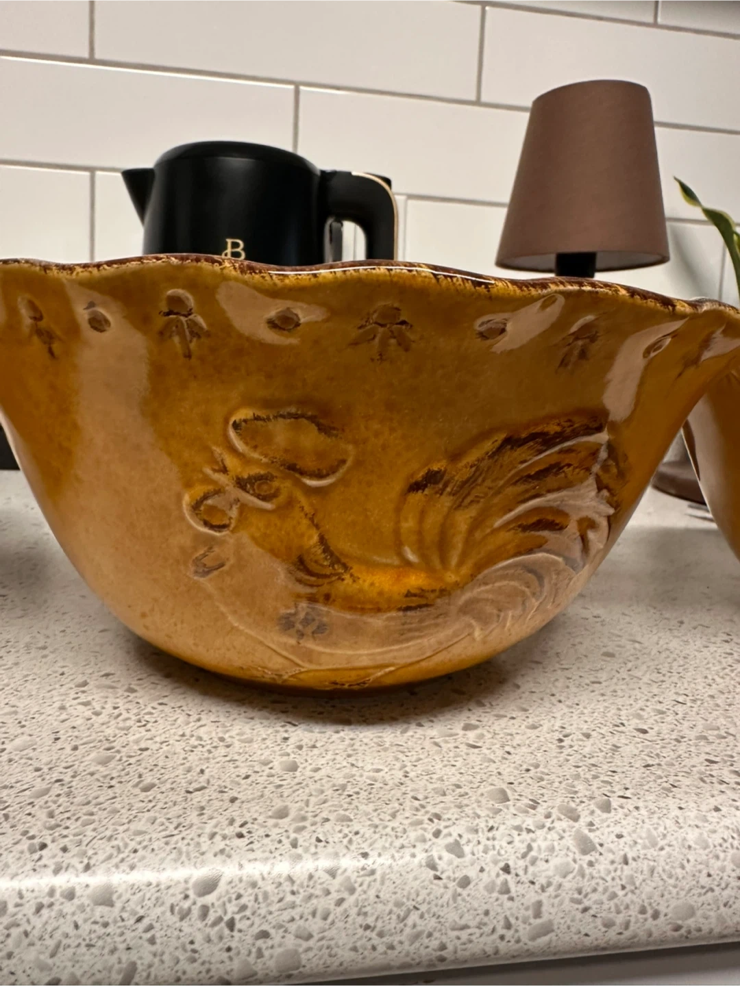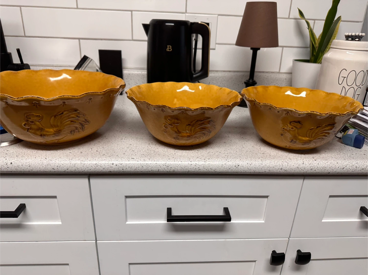 Selling a set of three ceramic bowls, each featuring a unique rooster design. They're in great shape and would add a touch of rustic charm to your kitchen or dining area. Perfect for serving salads, snacks, or displaying as decorative pieces perfect for upcoming Thanksgiving celebrations