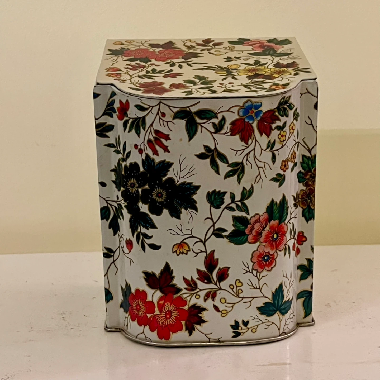 Vintage Daher floral tin container with hinged lid in great vintage condition. Made in England.