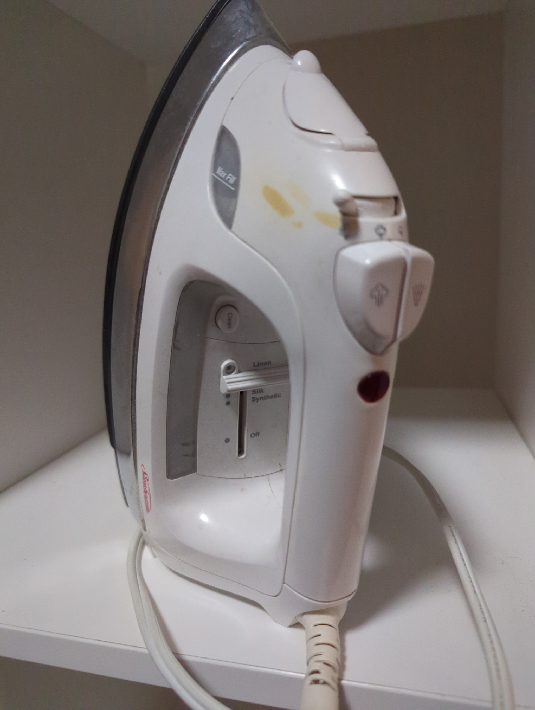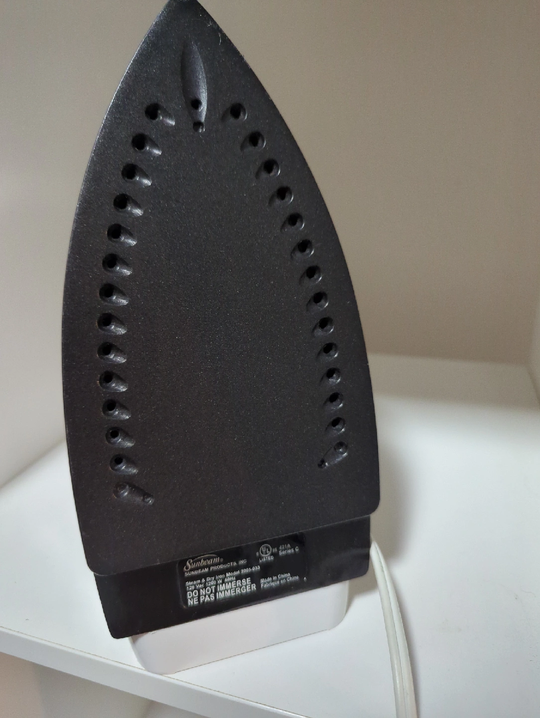 Selling a Sunbeam steam iron. It has settings for different fabric types like linen, silk, wool, and synthetic. Model number is 3663-836. There are some signs of use.
