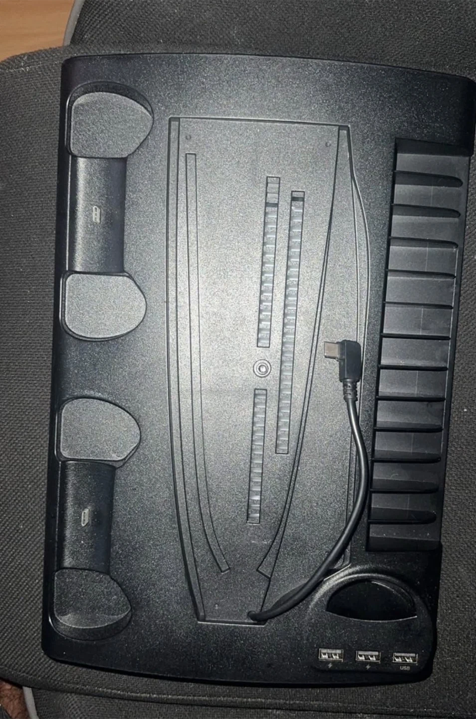 This PS5 cooling stand comes with a built-in controller charger to keep your PlayStation 5 running smoothly and your controllers ready to go! The unit is barely used but still works like new. It features a cooling fan and bays to charge two controllers.