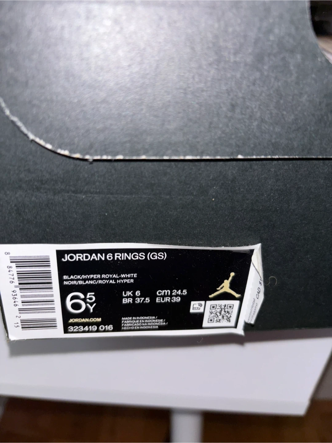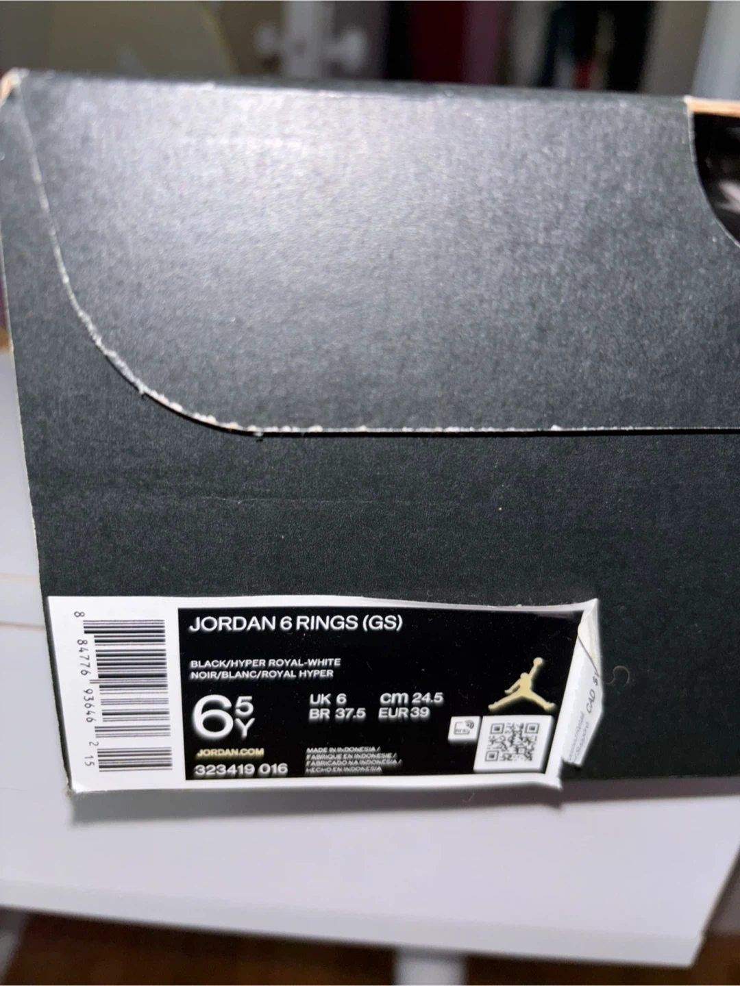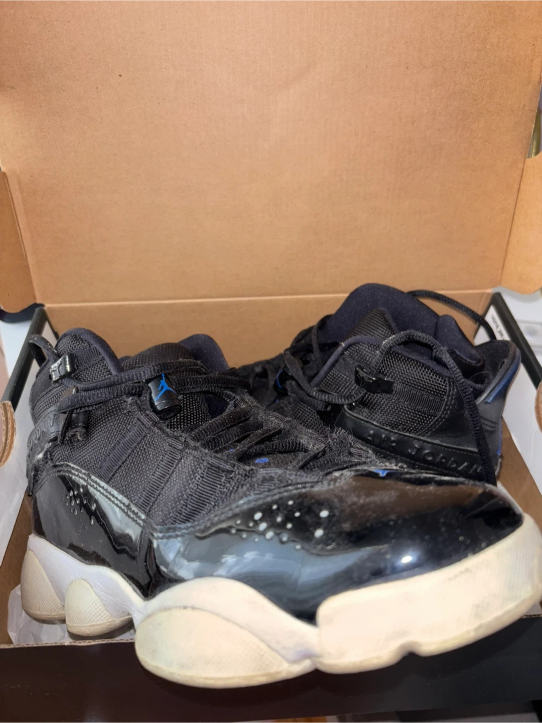 Selling a pair of Jordan 6 Rings (GS) in black and hyper royal. They are size 6.5Y and come with the box. Please see photos for condition