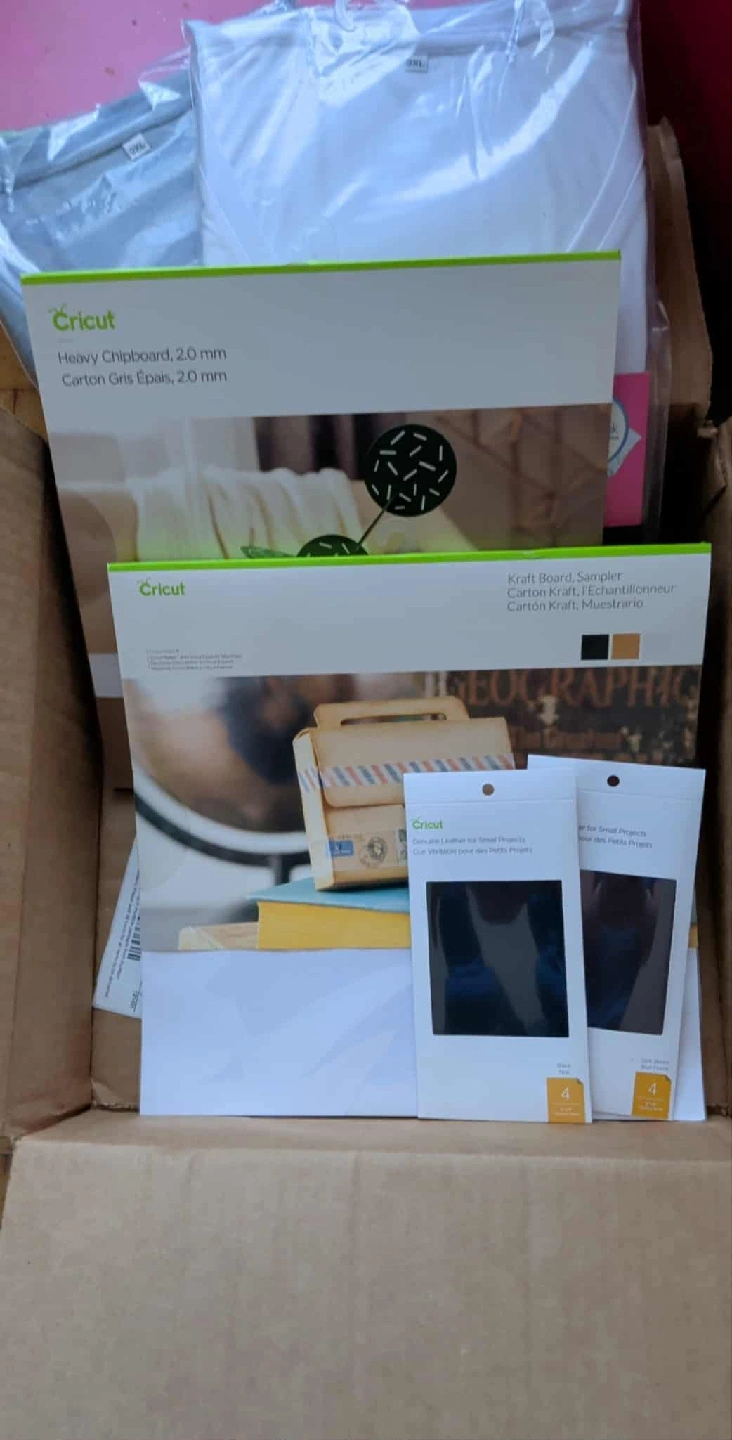 Selling a Cricut Heavy Chipboard (2.0 mm) and Kraft Board Sampler. Perfect for your crafting projects! Also includes Cricut leather and two size 3XL Cricut t-shirts.
