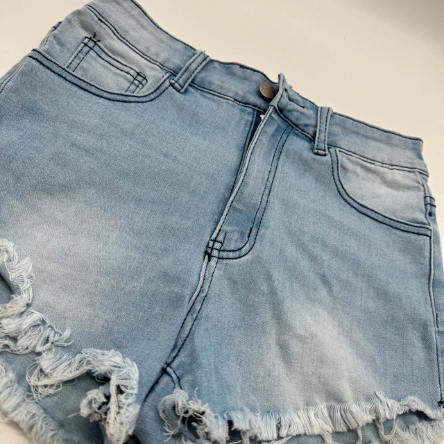 93New without tags. Trendy high-waisted denim shorts by SHEIN in a light blue wash with a raw/frayed hem. Comfortable stretch denim (85% cotton, 13% polyester, 2% spandex). Classic 5-pocket styling with button/zip fly and back patch pockets. • Size: US 6 (EU 38 / UK 10) • Color: Light Blue Wash • Condition: New, unworn (no tags) • Details: High rise, frayed cut-off hem, belt loops Perfect for summer, festivals, or casual everyday wear. 📍 Pickup in North york Delivery available for extra (CL)1286