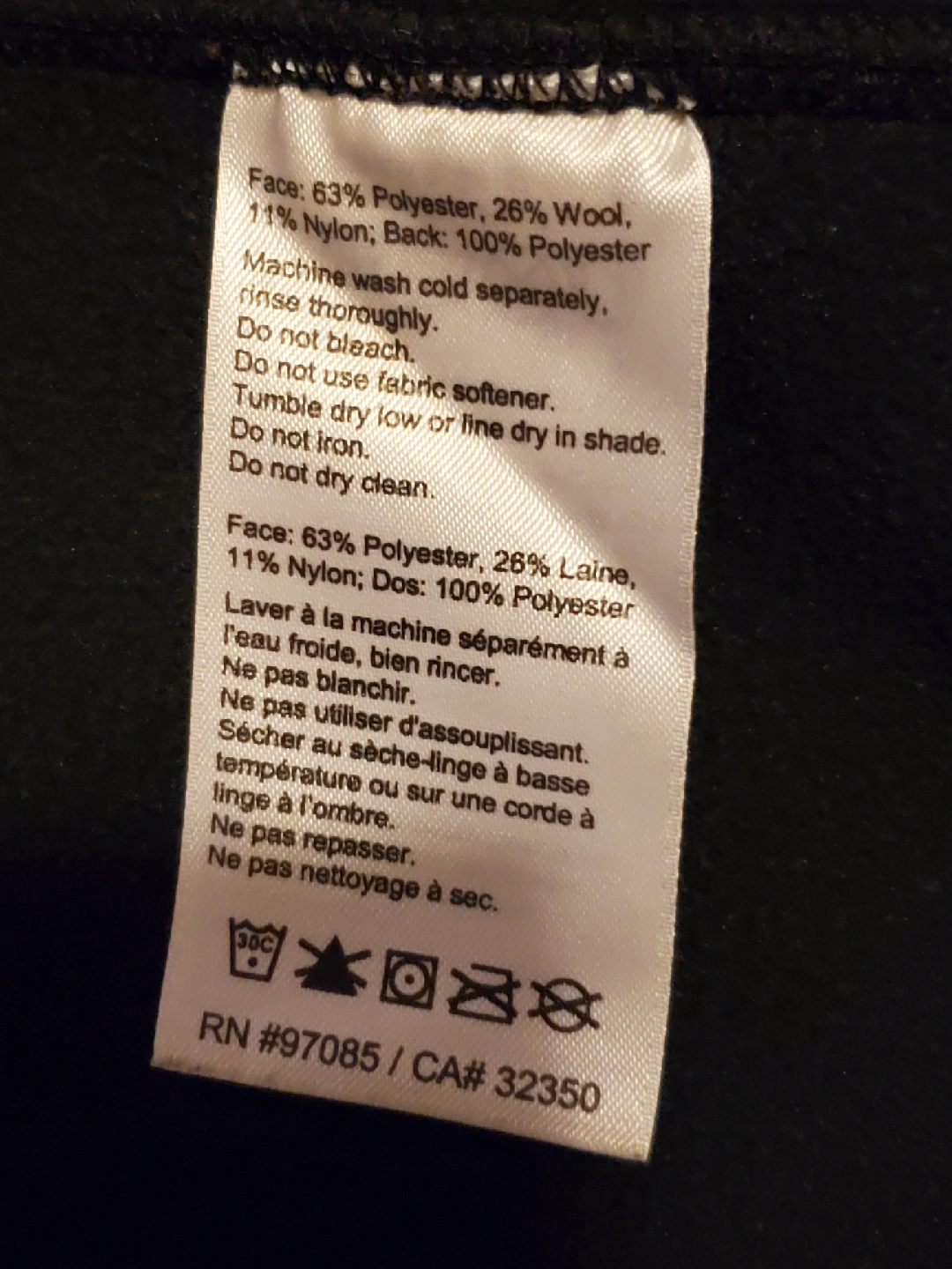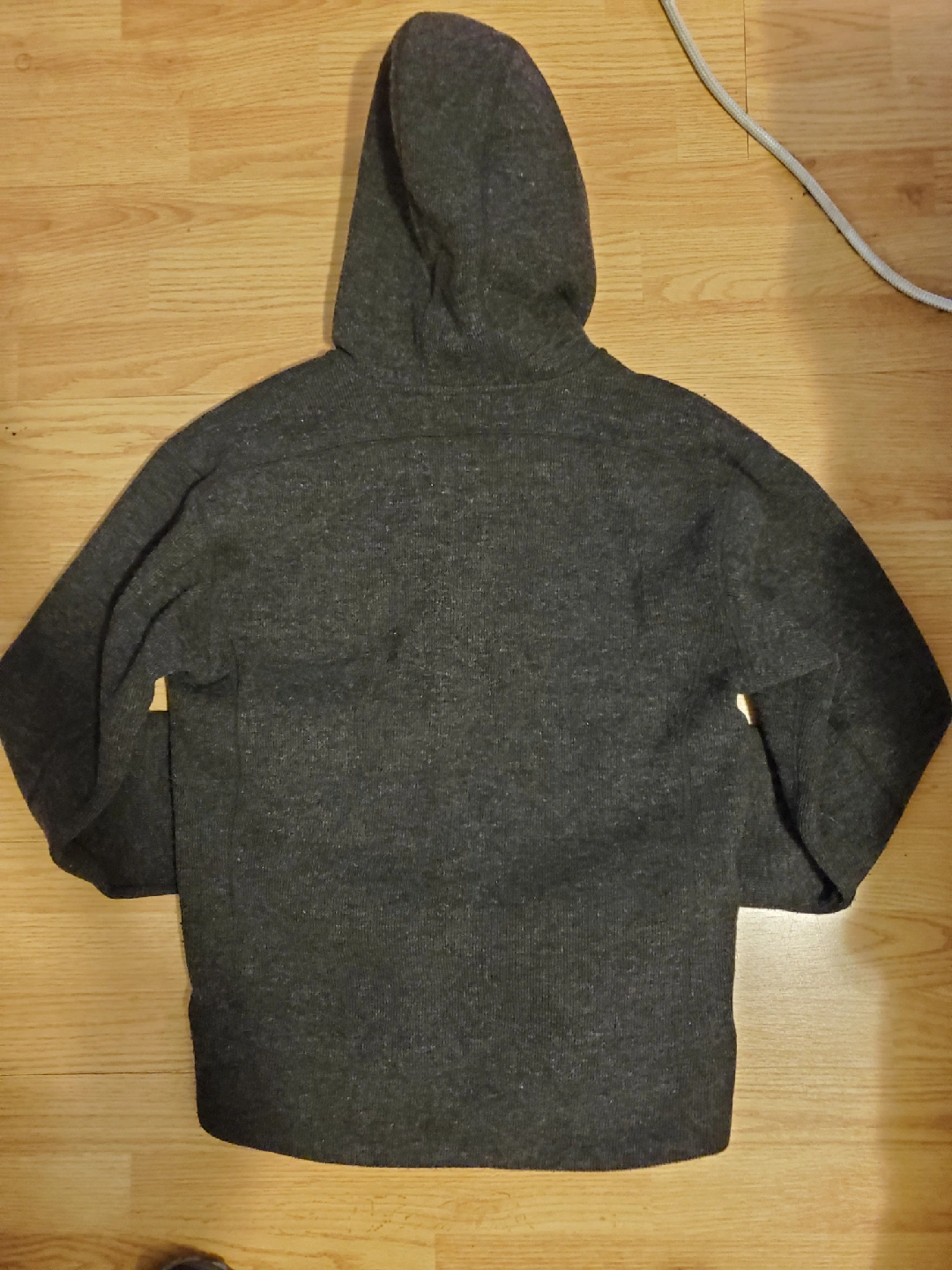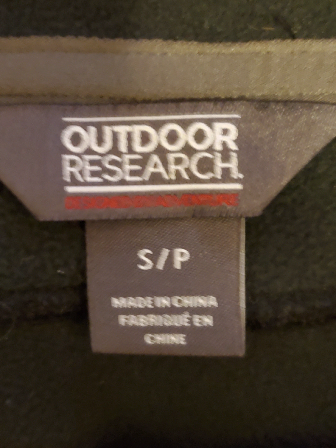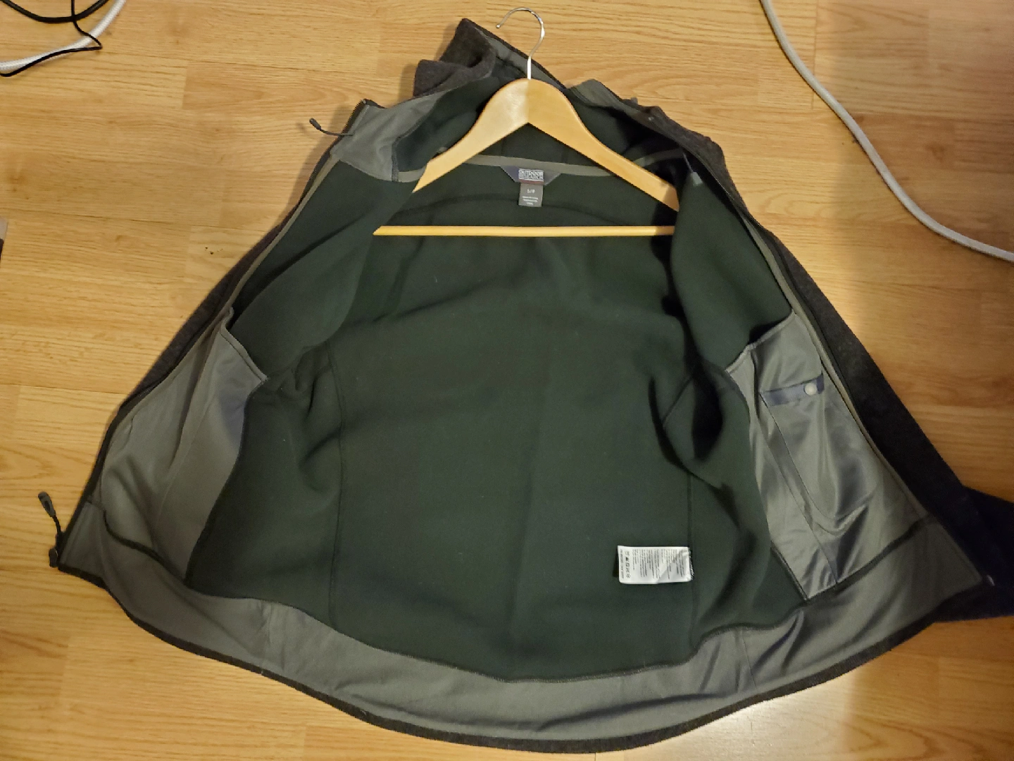 Outdoor Research Exit Hoodie 50911 in a dark grey colour. Size is small. The material is 63% polyester, 26% wool, and 11% nylon on the face, and 100% polyester on the back.