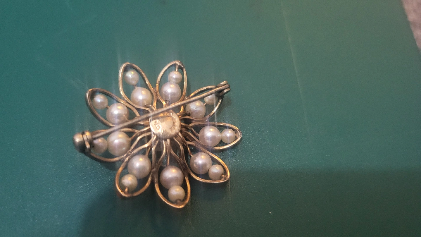 20Selling a lovely vintage flower brooch. It features a delicate design with faux pearls. A charming accessory to add a touch of elegance to any outfit!