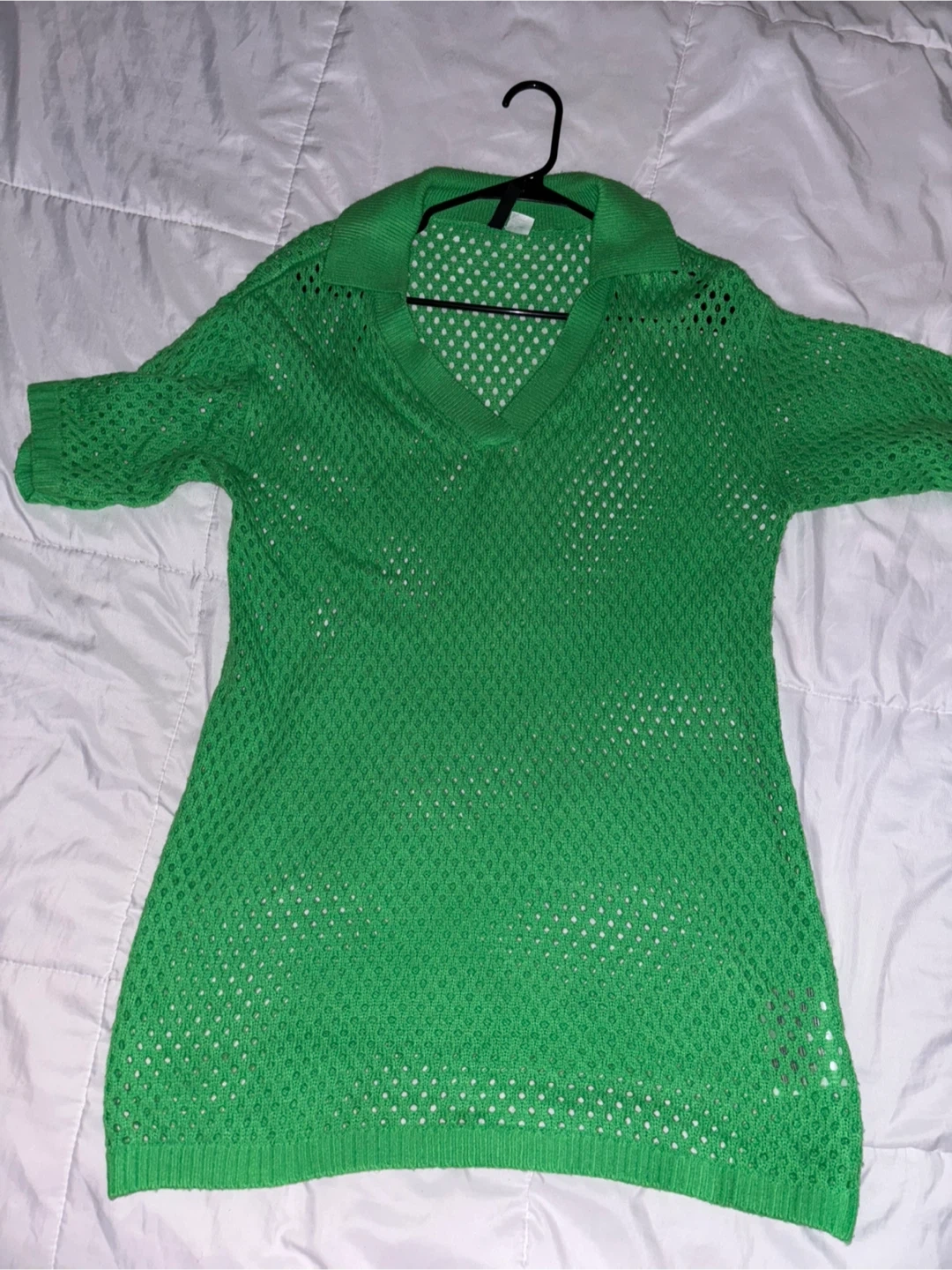 55This is a vibrant green knit top from H&M's Divided line! It's a size medium and features a unique, breathable design. Perfect for adding a pop of colour to your wardrobe!
