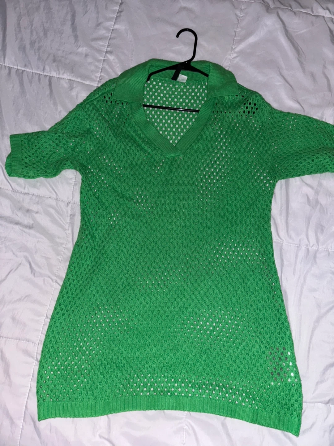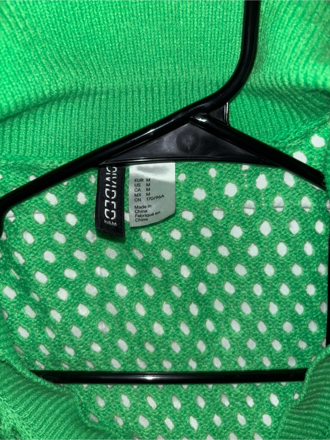 This is a vibrant green knit top from H&M's Divided line! It's a size medium and features a unique, breathable design. Perfect for adding a pop of colour to your wardrobe!