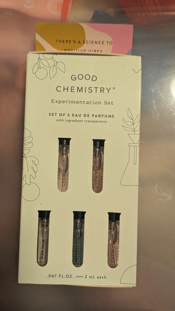 Selling a Good Chemistry Experimentation Set, which includes 5 different Eau de Parfums! Each vial contains .067 fl oz (2 mL) of fragrance. It's a great way to try out different scents from Good Chemistry!