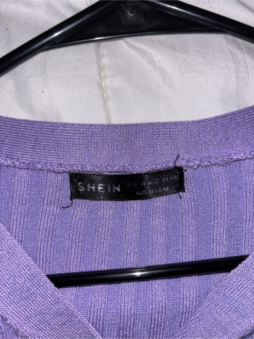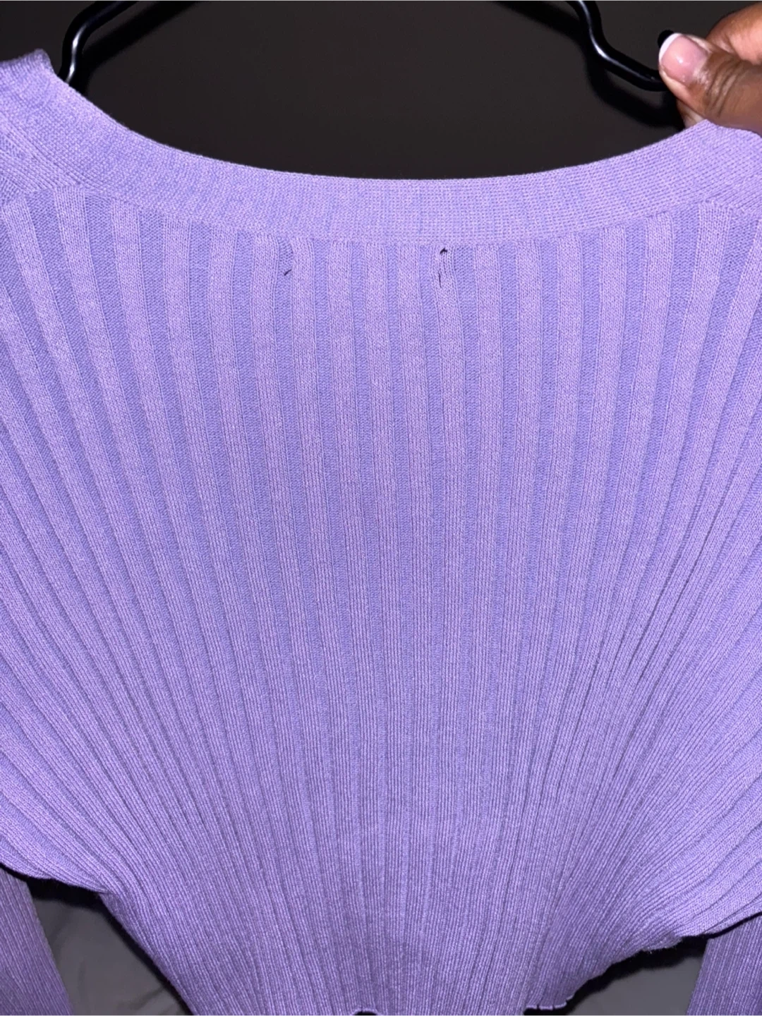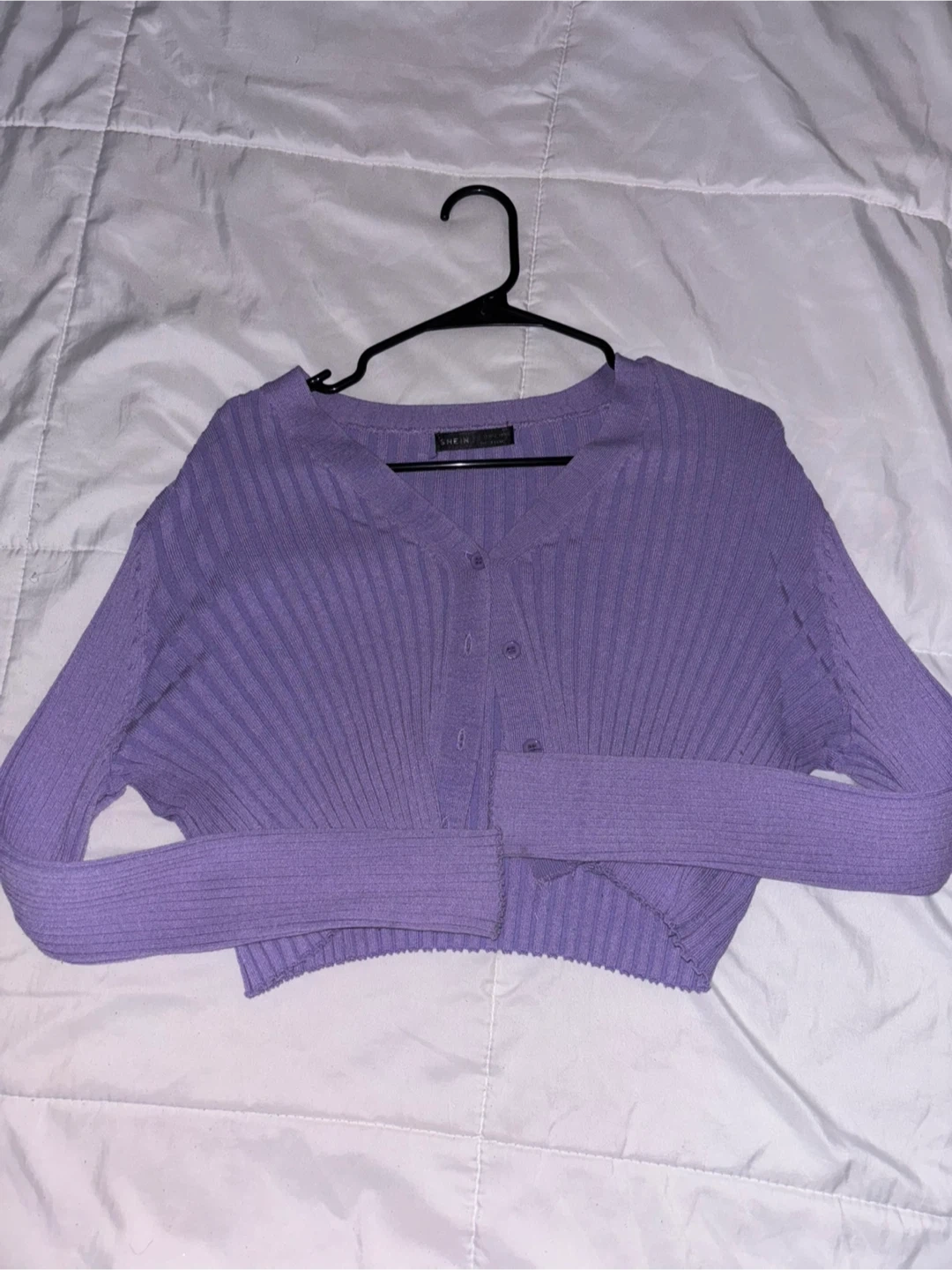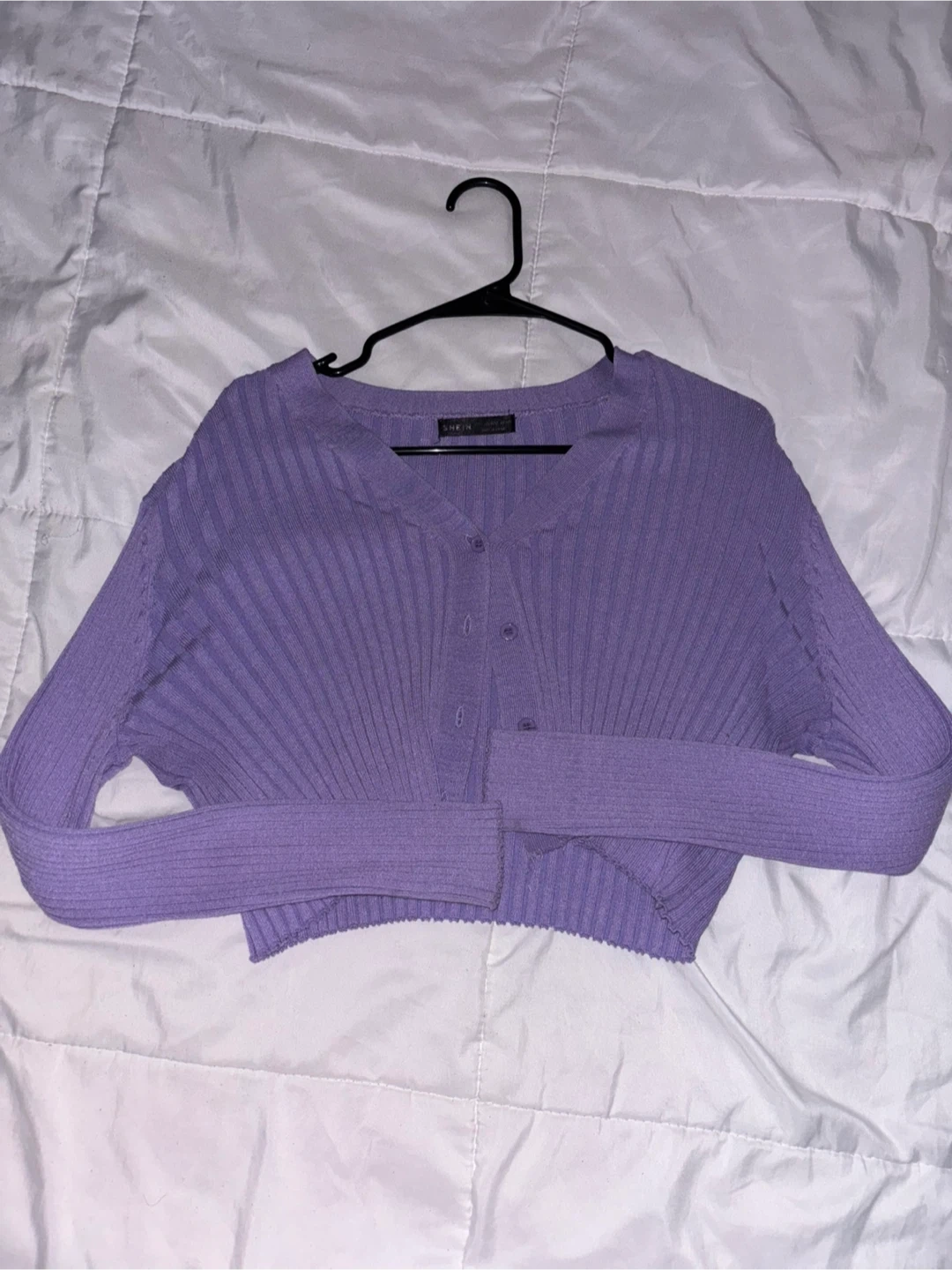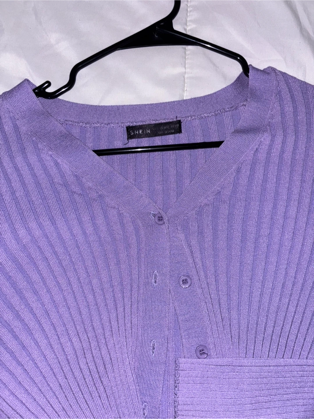 55A cute purple knit cardigan from SHEIN! It's a size small and has a button-up front. There are a couple of small snags on the back, as pictured.