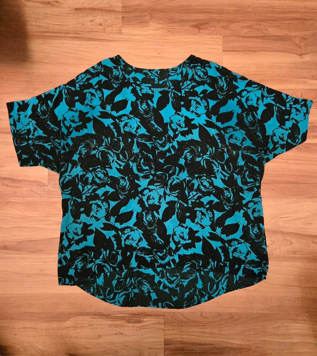 Selling a cute floral print top in blue and black! The pattern features roses and the material is lightweight and comfortable. The size tag is removed but it fits like a 2X.