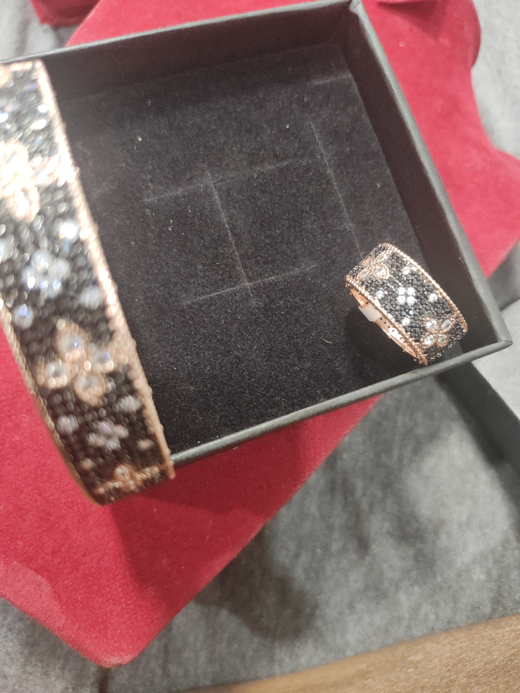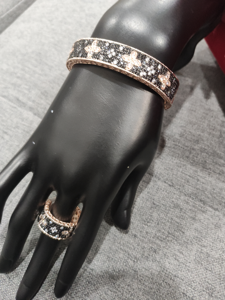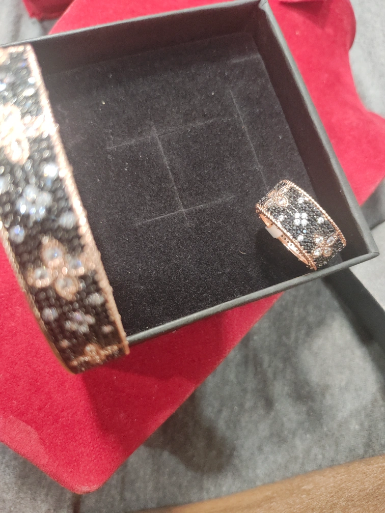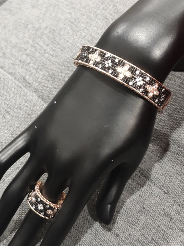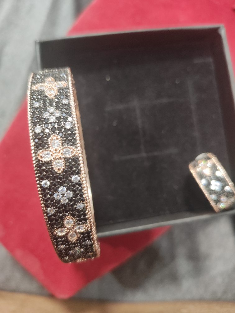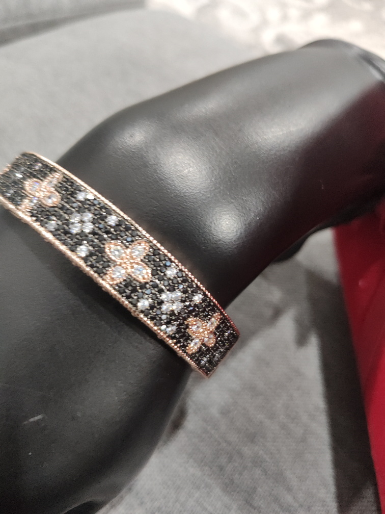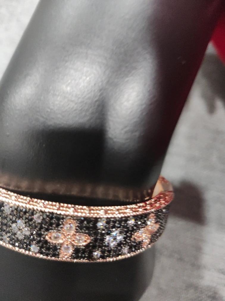 Selling a lovely rose gold bracelet with black and clear stones in a floral pattern. It's in great condition and would make a beautiful addition to any outfit!
