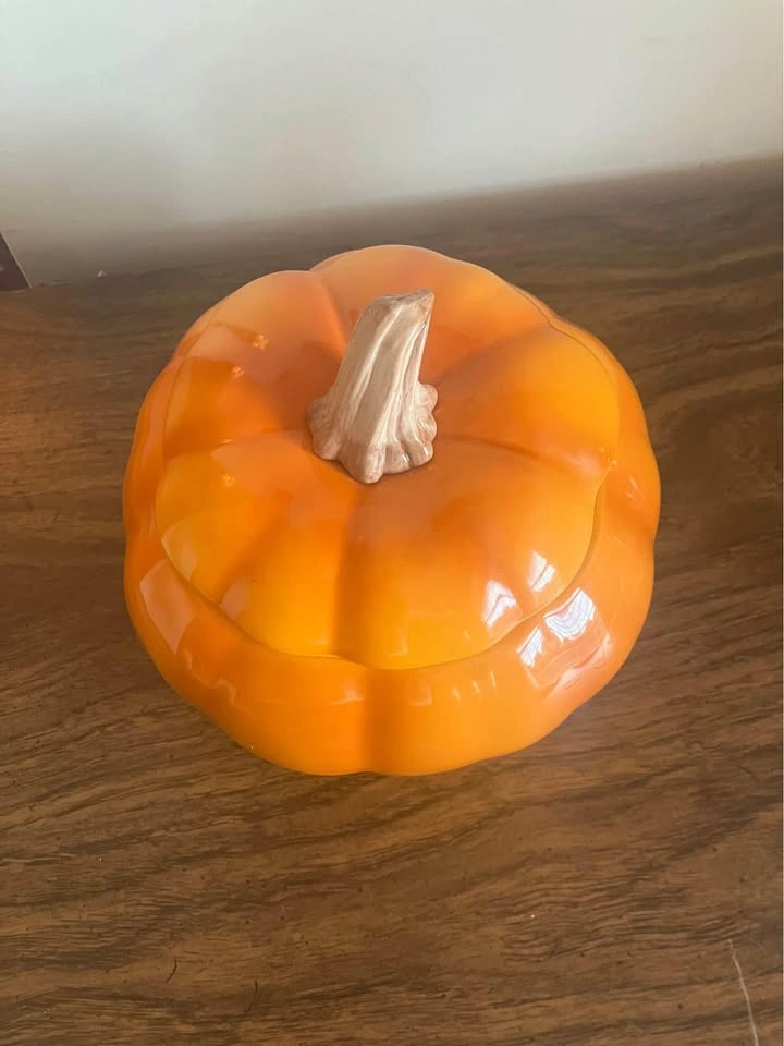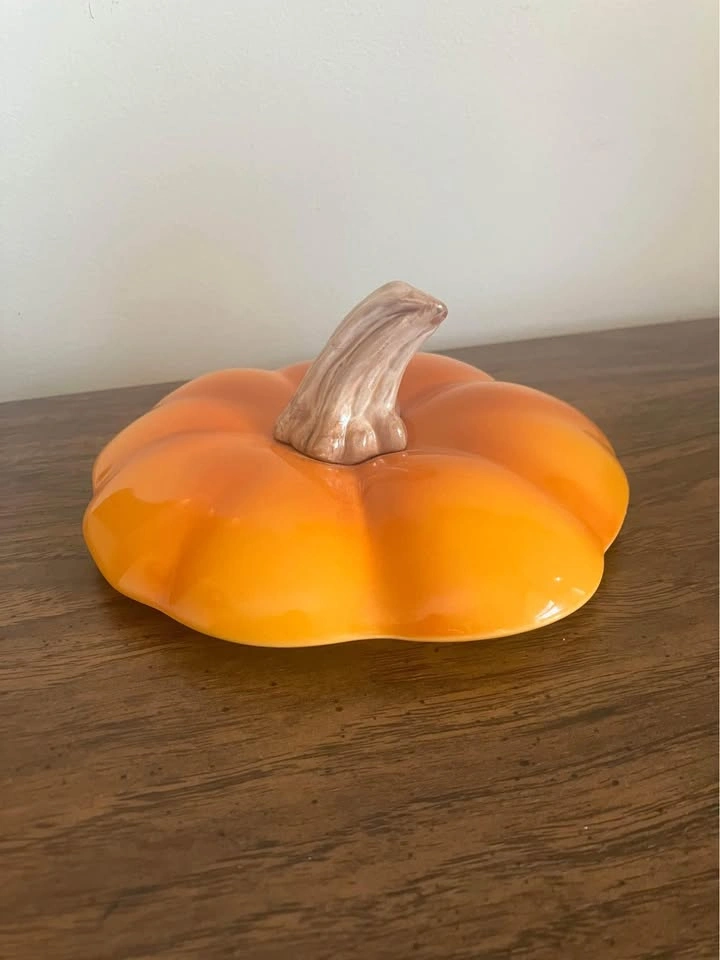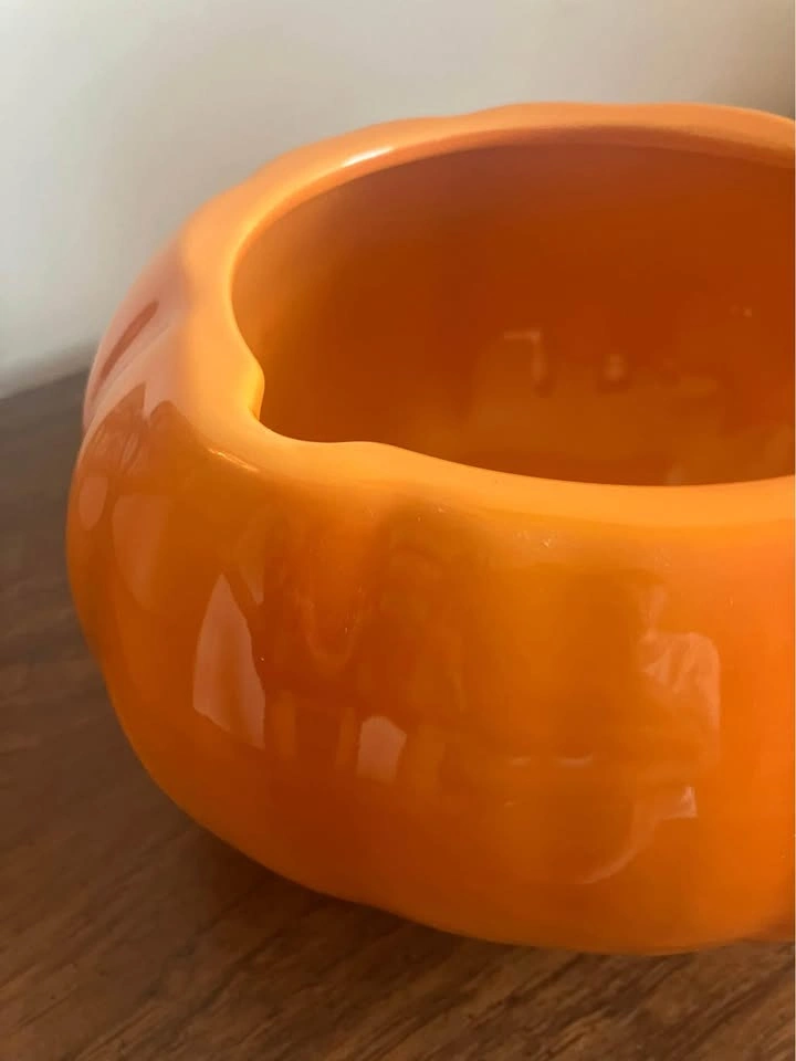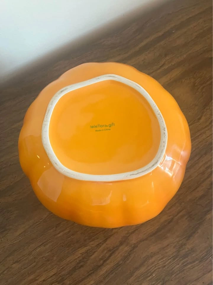 Teleflora Orange Ceramic Pumpkin Cookie, Candy Jar 8” x 7” - Like New The ceramic pumpkin has a removable lid and a stand for propping up the lid if you want to use it as a dried flower holder. It is in like new condition with no chips or cracks. This could be used as a cookie or candy jar, Halloween or Fall decor, planter etc. Measures 8” wide by 7” tall. From a smoke and pet free home. Check out in person before purchasing. Thanks for looking.
