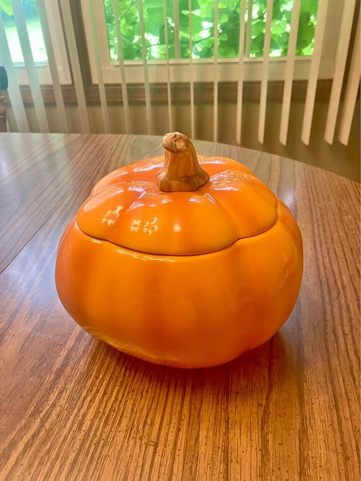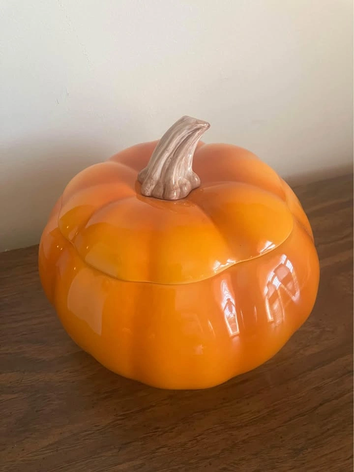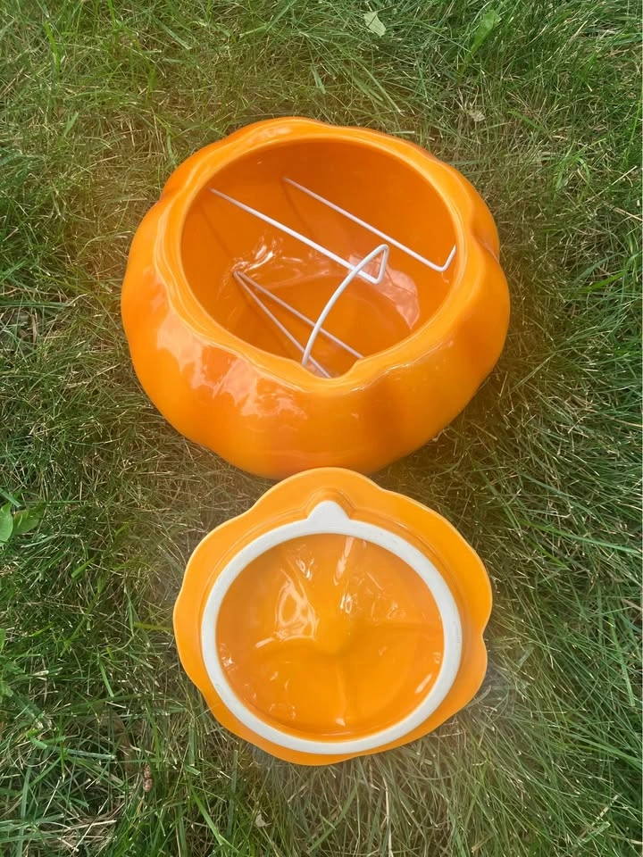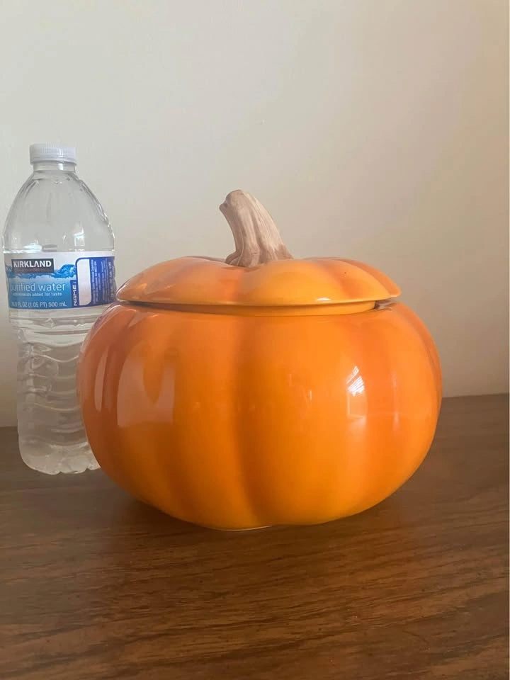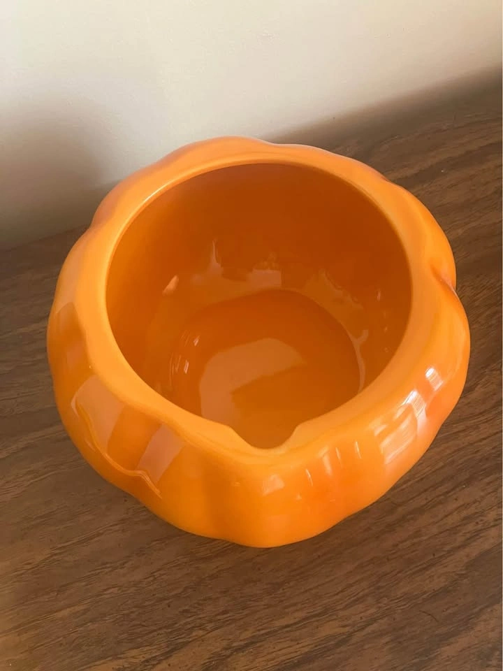 Teleflora Orange Ceramic Pumpkin Cookie, Candy Jar 8” x 7” - Like New The ceramic pumpkin has a removable lid and a stand for propping up the lid if you want to use it as a dried flower holder. It is in like new condition with no chips or cracks. This could be used as a cookie or candy jar, Halloween or Fall decor, planter etc. Measures 8” wide by 7” tall. From a smoke and pet free home. Check out in person before purchasing. Thanks for looking.