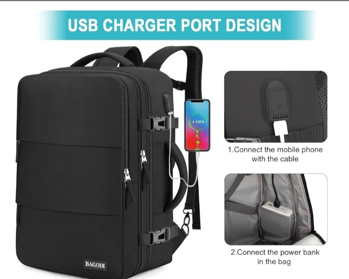 This is a BAGODI black backpack featuring a USB charger port design Connect your mobile phone with the cable or connect the power bank in the bag for easy charging on the go