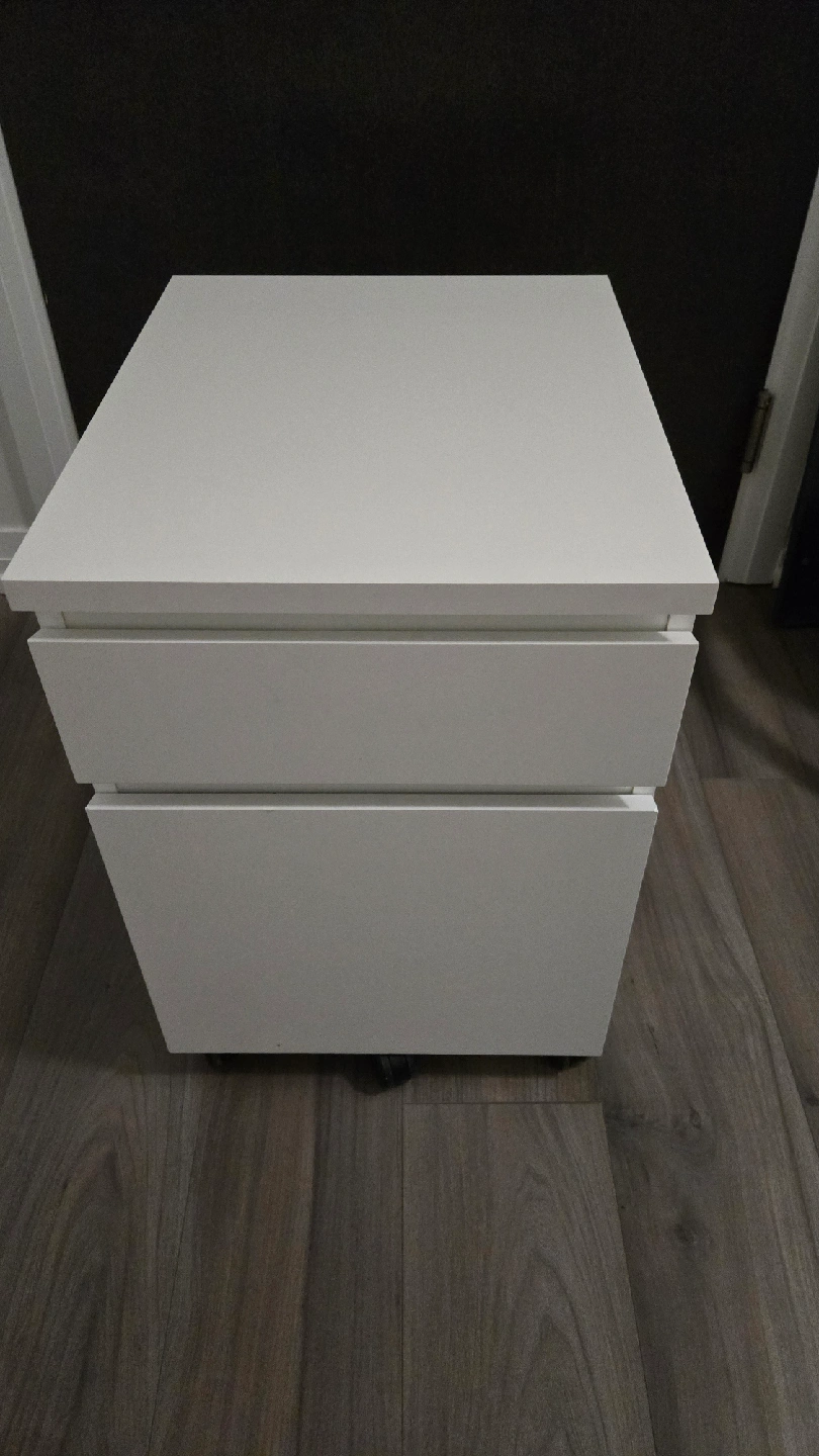 Here's a handy white filing cabinet with two drawers! It's on wheels, so it's easy to move around your home office, in a very good condition. Perfect for keeping your documents organized and tidy.