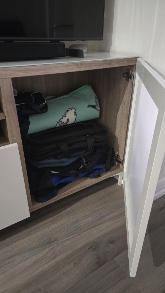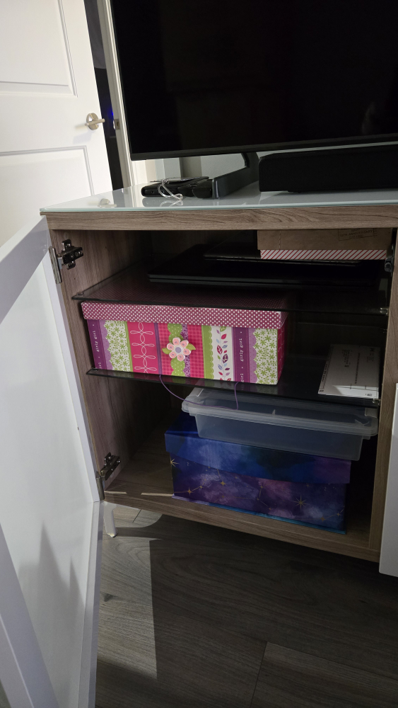 Selling a TV stand/entertainment unit. It has a combination of open shelving and closed storage. Great for organizing your electronics and accessories!