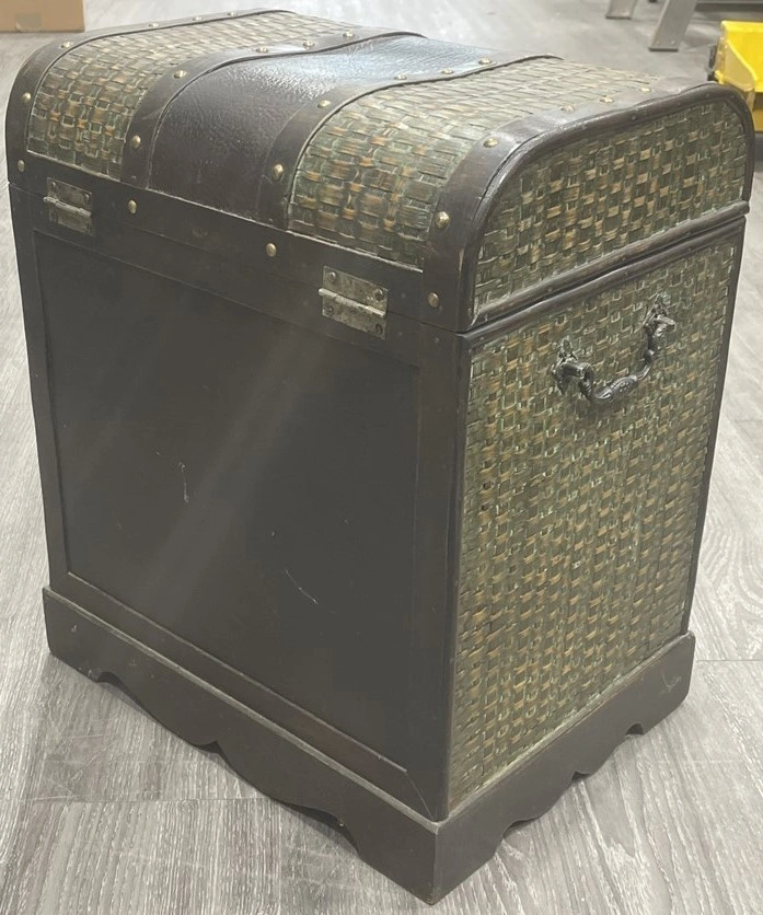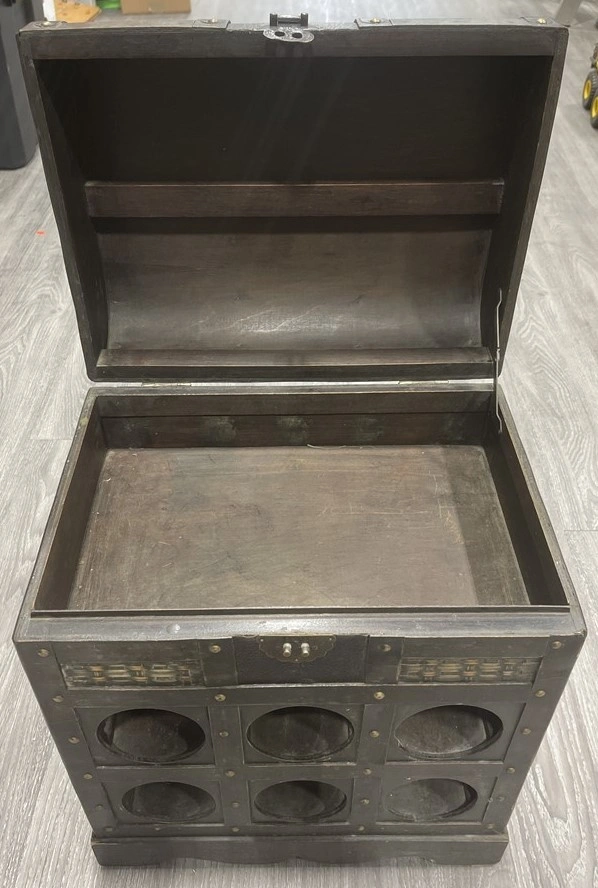 Treasure Chest Wine Rack with Storage – Decorative & Collectible E-Transfers Accepted Pick Up Anytime A standout piece that combines function, style, and collectible appeal. This Treasure Chest Wine Rack is crafted in wood with faux leather accents, brass rivet details, and woven panels that evoke the look of a vintage trunk. It’s as much a conversation piece as it is a functional wine rack. Features: Holds 6 wine bottles in front circular slots Hinged lid opens to reveal a spacious top storage compartment Faux leather & studded trim with decorative lock plate Side carrying handles for easy placement Rich dark finish with woven basket-style detailing Size: approx. 21” tall × 16” wide × 13” deep Perfect as a home bar accent, wine display, or collectible trunk chest This piece works beautifully as functional décor for a bar area or as a collector’s treasure chest with purpose, adding a touch of character to any room. wine rack, treasure chest, bar decor, vintage style storage, wine furniture, home bar, trunk wine rack, wooden wine holder, collectible wine chest Price: $125 CAD Unique and functional – ideal for both collectors and home entertainers.