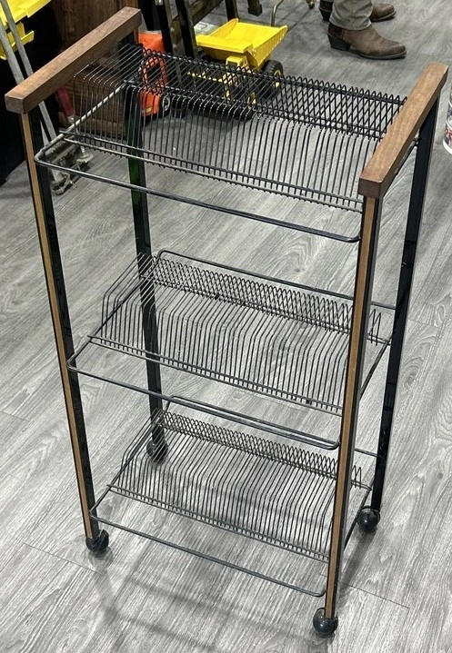 Vintage Rolling Record Stand – Mid-Century Vinyl Rack 37” Tall E-Transfers Accepted Pick Up Anytime A superb vintage rolling record stand, blending form and function with timeless mid-century appeal. Featuring black metal wire racks with rich wood side accents, this stand offers three tiers of angled storage for vinyl records, making browsing and organizing effortless. The smooth-gliding casters provide easy mobility, while its sturdy frame ensures lasting durability. At 37” tall and 19” wide, this is larger than most typical vinyl stands, giving it standout presence and expanded storage capacity. Perfect for audiophiles seeking a functional display solution, or collectors who appreciate the clean lines and warm details of mid-century design. Comparable rolling vinyl stands typically range $100–125 CAD, but taller, wood-accented examples like this command more. Priced fairly at $150 CAD, with market value likely in the $175+ range for discerning collectors. vinyl record stand, LP storage, mid-century modern, retro audio furniture, rolling record cart, MCM style, vintage furniture, collector display, audiophile Price: $150 CAD