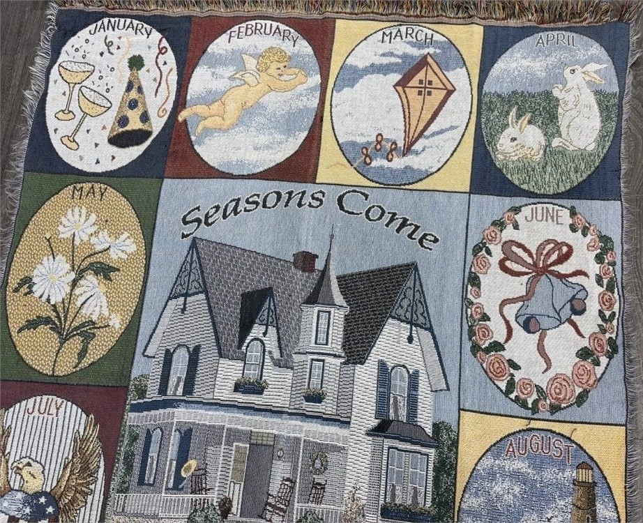 RARE VINTAGE “SEASONS COME, SEASONS GO” WOVEN TAPESTRY THROW – 65” x 48” E-Transfers Accepted Pick Up Anytime A striking vintage woven tapestry blanket showcasing the theme “Seasons Come, Seasons Go.” Each month of the year is illustrated with vivid woven motifs — January champagne glasses, April rabbits, July eagle, October scarecrow, December holiday scene, and more — surrounding a grand Victorian-style home at the center. This textile is a work of art as much as it is a functional throw. Measuring approx. 65” long x 48” wide with a fringed edge, it can be displayed as a wall hanging, draped across furniture, or used as a collectible accent rug. The detailed craftsmanship and nostalgic imagery make it a standout piece for collectors and décor enthusiasts alike. Excellent vintage condition with vibrant colors. Rare to find with the complete 12-month design intact. vintage woven throw, tapestry blanket, collectible textile, wall hanging, seasonal décor, Victorian house motif, cottagecore, farmhouse décor, rare vintage blanket Price: $75 CAD