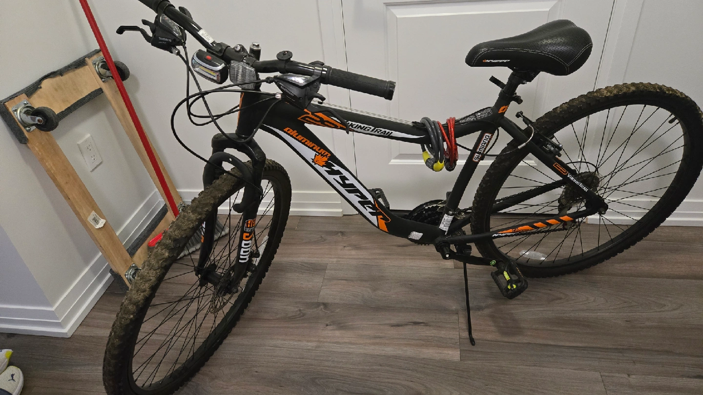 Selling a used Hyper Viking Trail mountain bike. It features an aluminum frame and is perfect for hitting the trails or just getting around town. It has some wear and tear, as shown in the photos, but it's still in good working condition and ready for a new owner!