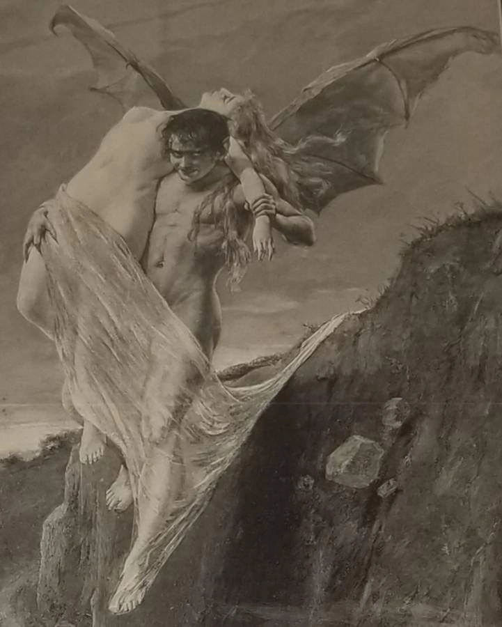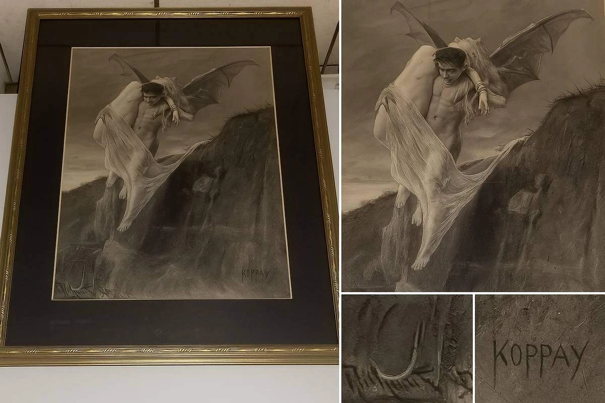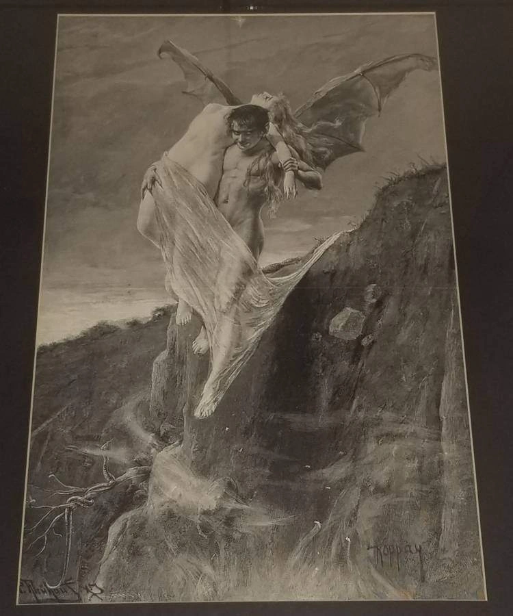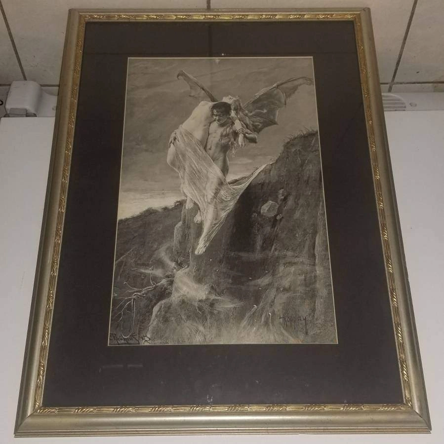 RARE 1800s Haunting Masterpiece “The Abduction” Signed by Thumann & Koppay E-Transfers Accepted • Pick Up Anytime A visually arresting and emotionally intense antique photogravure reproduction titled The Abduction — a dramatic 19th-century composition by German artist Ernst Thumann (1834–1909), with engraving work by Hungarian illustrator Károly (Carl) Koppay (1859–1909). This powerful scene captures a winged demonic figure abducting a woman from a cliffside — a haunting allegorical image often interpreted as the soul in peril, temptation, or mythological struggle. 🖼️ Key Details: Artist: Ernst Thumann (signed lower left) Engraver: Károly Koppay (signed lower right) Medium: High-quality photogravure (not an etching) Era: Late 19th to early 20th century Presentation: Framed under glass with gold-toned frame and deep matting Size: 26" tall × 20" wide (framed) Condition: Excellent presentation; both bottom frame joints need re-gluing This piece was originally valued at $1,500 CAD over 20 years ago and is now offered at $1,750 CAD to reflect modest inflation and its rarity. Comparable antique photogravures of this caliber — especially signed by both artist and engraver — are highly collectible and increasingly scarce. An ideal piece for collectors of Romantic, Symbolist, or gothic artwork, or those drawn to mythological and allegorical imagery. Striking visual impact when hung — and protected under glass for preservation. thumann, koppay, ernst thumann, victorian art, gothic photogravure, demonic abduction, mythological symbolism, antique erotic art, soul allegory, romanticism, 1800s print, framed classical artwork, european antique print, allegorical scene, antique under glass