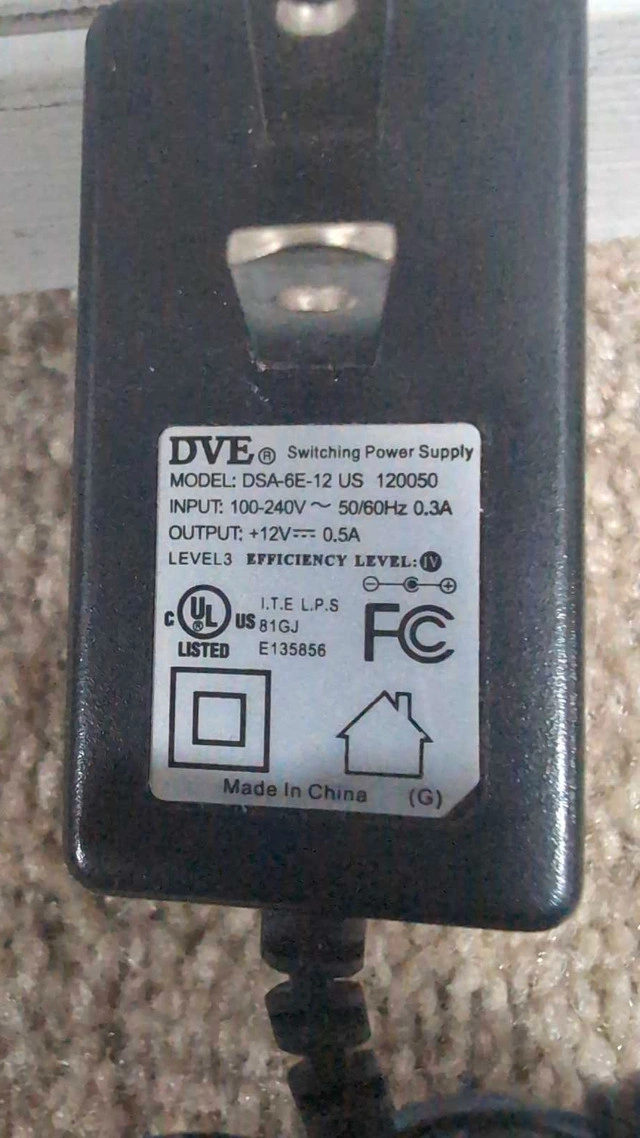 This is a DVE Switching Power Supply, model DSA-6E-12 US. It supports an input of 100-240V ~ 50/60Hz 0.3A and provides an output of +12V - 0.5A. This power supply is in used condition. It powers up electronic devices with a barrel connector. * Model: DSA-6E-12 US * Input: 100-240V ~ 50/60Hz 0.3A * Output: +12V - 0.5A