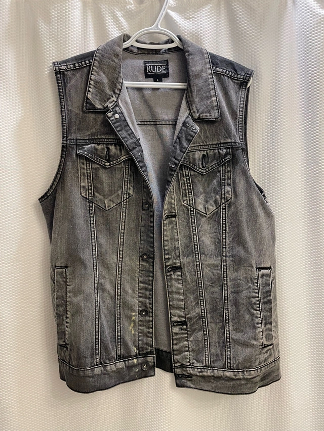 Add some edge to your wardrobe with this Rude brand denim vest, showcasing a unique American flag design on the back. This vest is in good condition, perfect for layering and making a statement. Additional details: * Brand: Rude * Design: American Flag Back * Size: M Looking to add a bit of rock 'n' roll flair to your closet? This vest might just be your next favourite piece! And a friendly note: if you're seeing this ad, it means the vest is still up for grabs!
