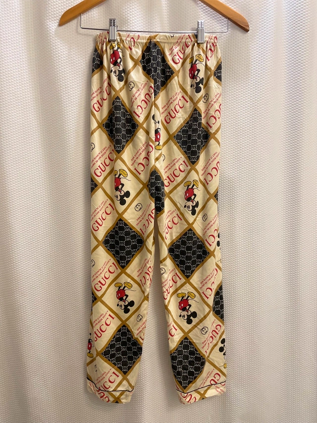 These fun Gucci pants feature a playful Mickey Mouse design and a comfortable elastic waist, perfect for lounging or making a statement. Please note that these pants are in used condition. Here are some details: