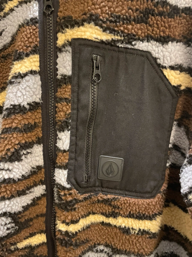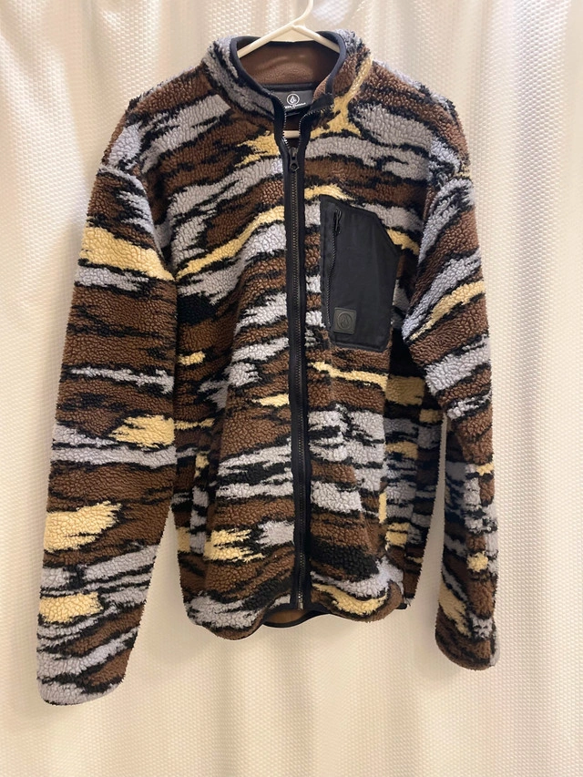 This Volcom fleece is perfect for adding warmth and style to your wardrobe. It features a distinctive camo pattern and a practical zip-up pocket on the chest. It's been gently worn but remains in good condition. I'm pricing it at $65 due to its excellent condition and unique design. Key features include: * Full zip-up design * Chest pocket with zipper * Soft fleece material * Unique camo pattern Just a friendly heads-up: if you're seeing this ad, the fleece is still available!